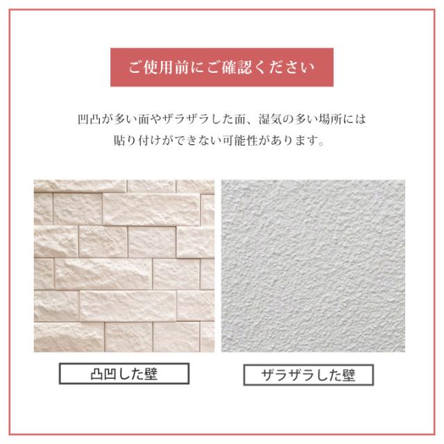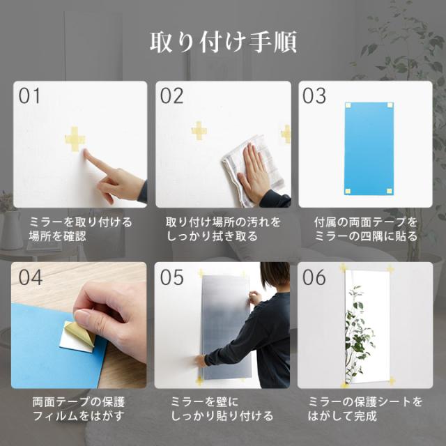 | ・直射日光の当たる場所又は熱・火は避けて下さい。 ・本商品はアクリルミラーです。素材の特性上、歪みが生じる場合があります。 ・平らで乾いた壁面にご使用ください。 ・本商品はガラス、タイル、金属塗装面、プラスチック面、化粧合板、木部に塗装を施したものに貼り付けが可能です。 ・凹凸が多い面やザラザラした面、湿気の多い場所では貼り付けができない場合があります。 ・取り付け面のホコリ、油分、水分はあらかじめ拭き取ってください。 ・貼り直しを行うと粘着力が弱まる可能性があります。 ・貼り付け後は、落下しないよう確実に固定されていることをご確認下さい。 ・裏面4箇所のテープがしっかりと接着しているか定期的に点検して下さい。落下破損の原因になります。 ・小さなお子様の手の届かない場所でご使用ください。 ・ミラー面には保護フィルムが貼られています。ご使用前に剥がしてください。 ・粘着テープを壁から剥がす際、壁紙などを痛める可能性があります。壁への影響が気になる場合は、あらかじめマスキングテープなどで保護してから貼り付けてください。 ・本商品は壁面を傷つける場合があります。壁への影響が気になる場合は、あらかじめマスキングテープなどで保護してから貼り付けてください。 ・歪みのない映りを求める場合は、平面にしっかりと貼り付けてご使用ください。 ・必ず本来の用途だけにご使用下さい。 ・本商品は家庭用として企画されたものです。業務用としてのご使用は出来ません。 |