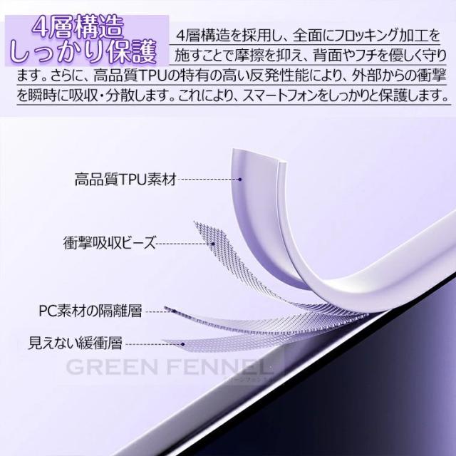 柔軟性と弾力性に優れたTPU素材を使用し、内部には液体衝撃吸収ビーズを搭載しています。これにより、落下時の衝撃を効果的に分散し、スマートフォンをしっかりと保護します。高い耐衝撃性を備えたこの製品で、大切なスマホを安心してお使いいただけます。