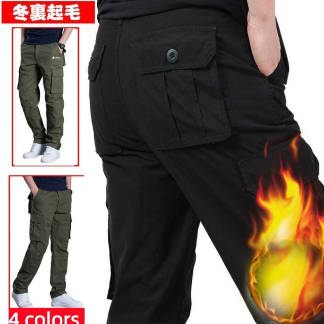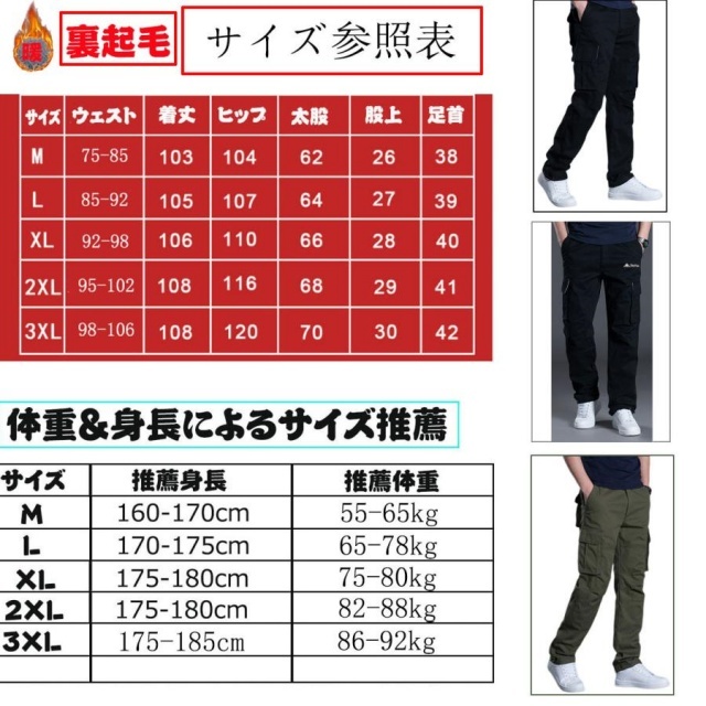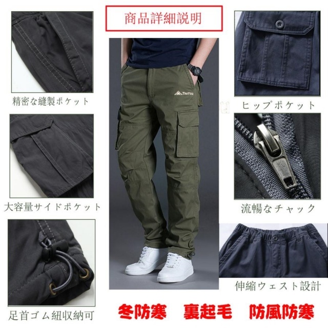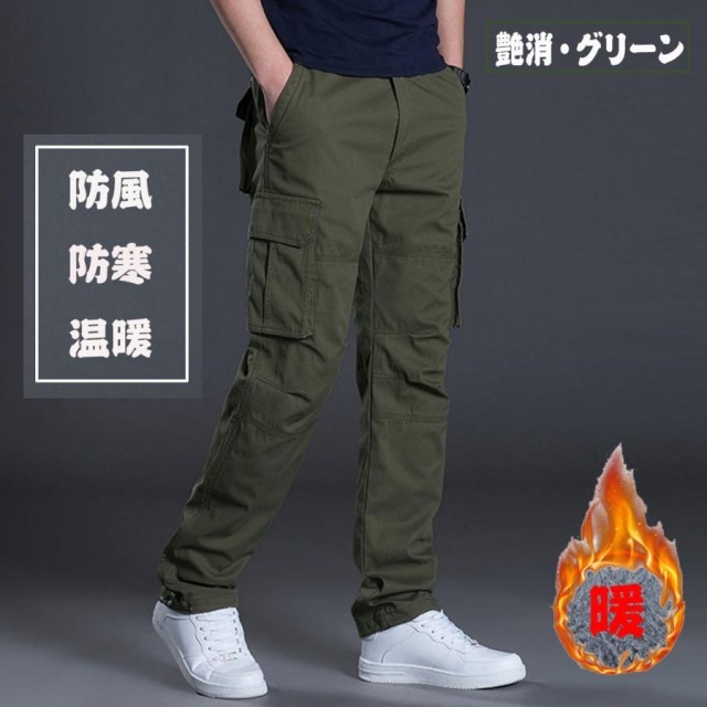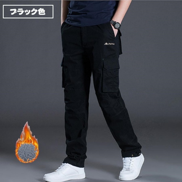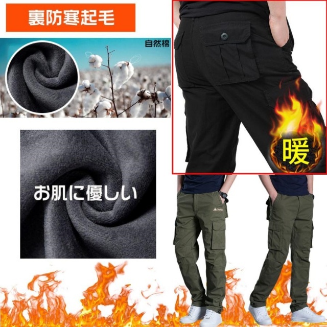 【防寒裏起毛】流行的なカーゴパンツのシルエットを持ち、裏生地には保温のぽかぽかしてる裏起毛が付いています。