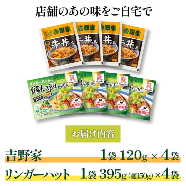 吉野家牛丼の具・リンガーハット野菜たっぷりちゃんぽん各4食セット
