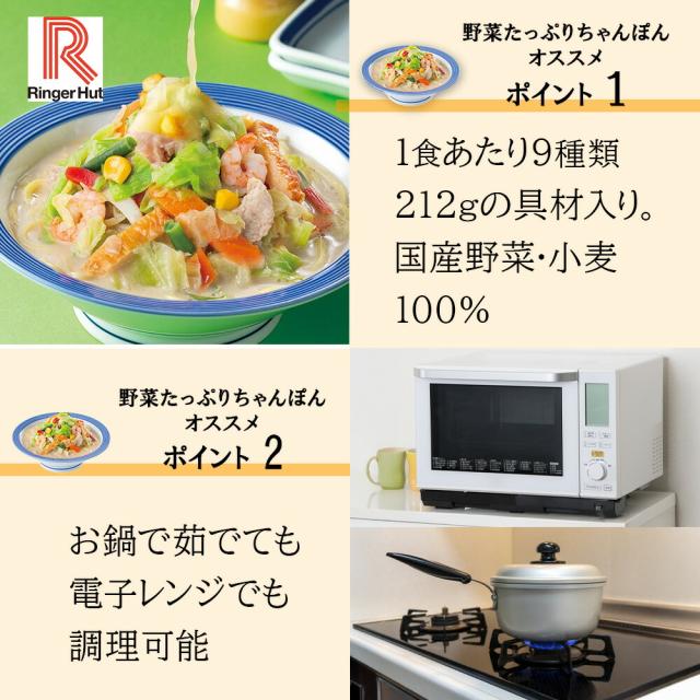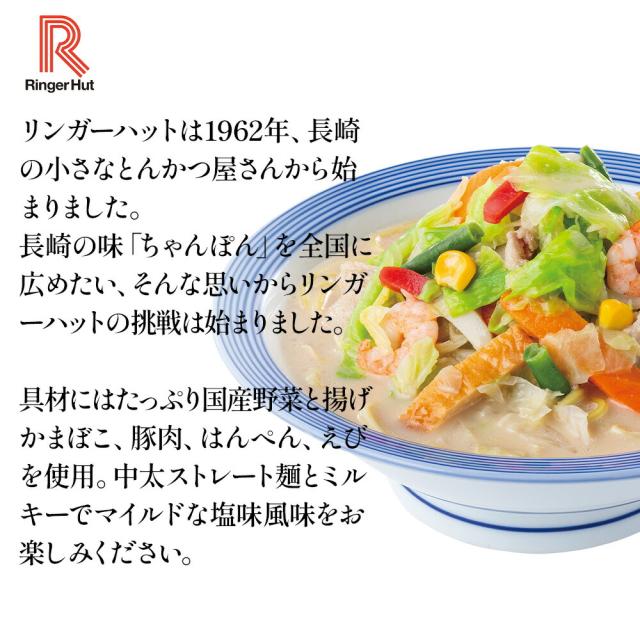 全国に展開する長崎ちゃんぽん専門店「リンガーハット」。店舗で味わえる長崎ちゃんぽんをご家庭で手軽に食べられるようにアレンジされた「野菜たっぷりちゃんぽん」です。9種類の具材、キャベツ、玉ねぎ、にんじん、いんげん、コーン、揚げかまぼこ、豚肉、はんぺん、えびを使用。野菜は全て国産です。麺の製造もリンガーハットの工場でつくった自家製麺。中太のストレート麺がスープとよく合います。独自開発のスープは、コクのあるミルキーでマイルドな塩味風味。