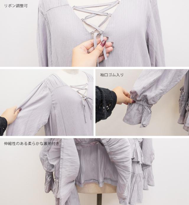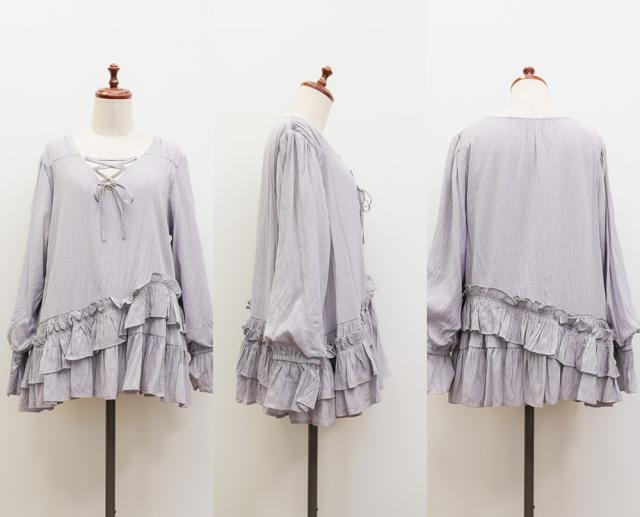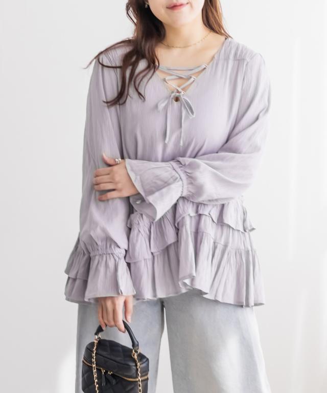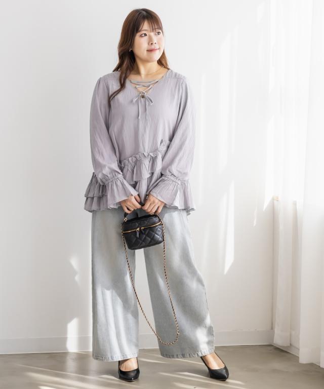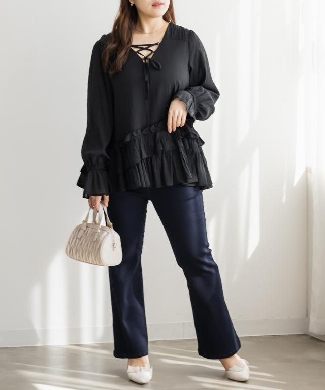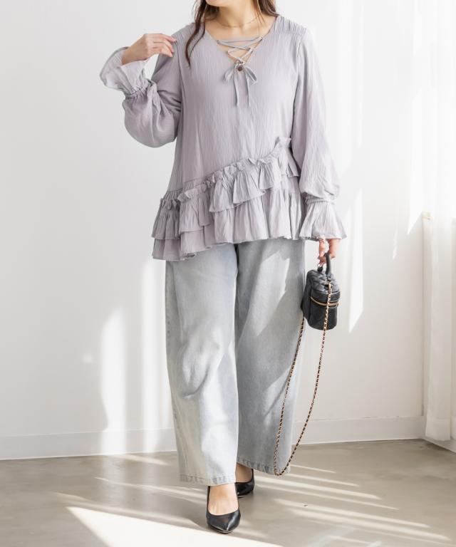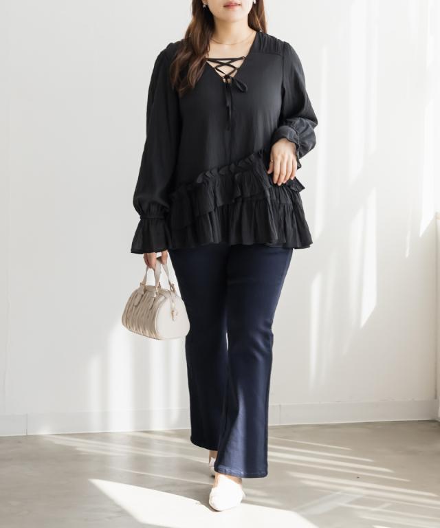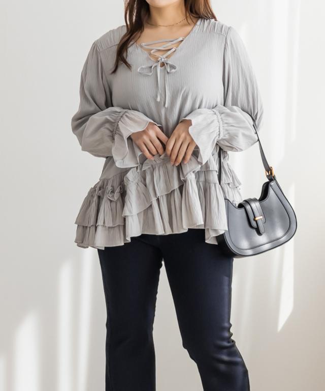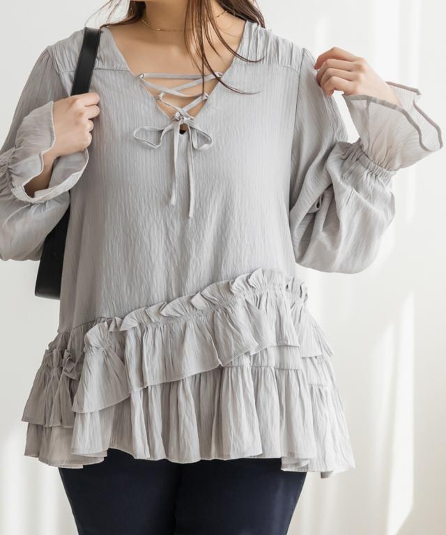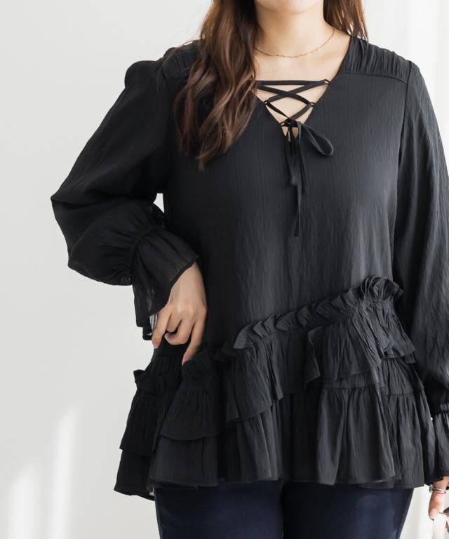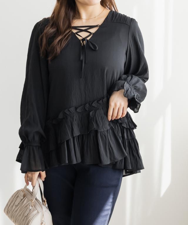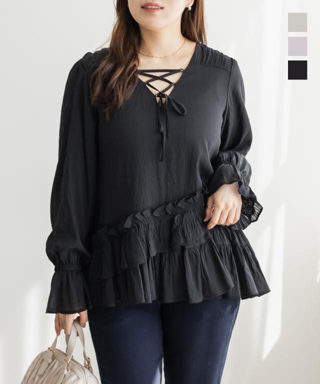 大きいサイズ/レディース/LL/3L/4L/CLETTEオリジナルななめフリルレースアップブラウス