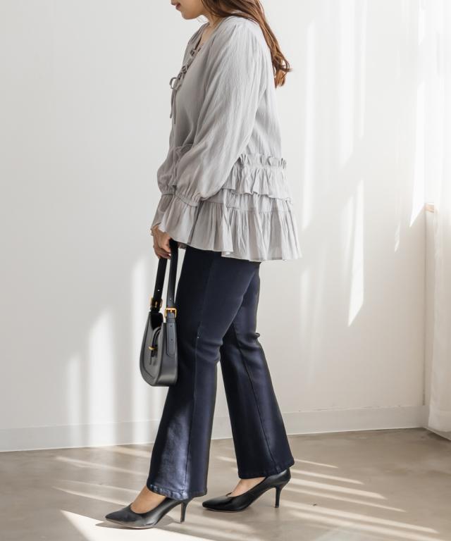 | 3Lを着て程よくゆとりがあって余裕をもって着ることができました。Aラインシルエットが体型をカバーしてすっきりとした印象にしてくれます◎しかもさらっとした肌ざわりで着心地も軽やかなのでロングシーズン活躍しそうです♪フロントのレースアップデザインが女性らしいポイントで、ネックラインはすっきりと開いており顔回りも綺麗な印象◎大人っぽいけどフェミニンな雰囲気もあり、様々なシーンで使えそうです!パンツは勿論、コンパクトなスカートと合わせても可愛いです。 |