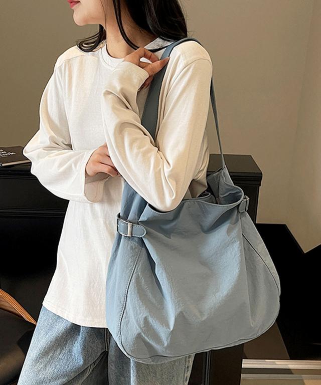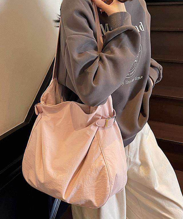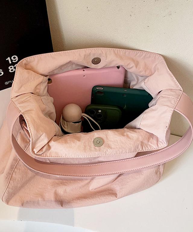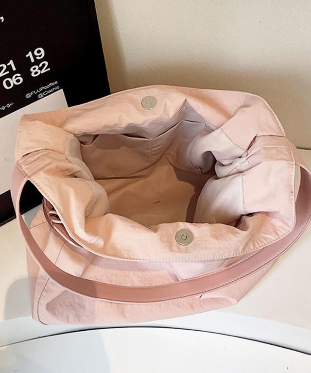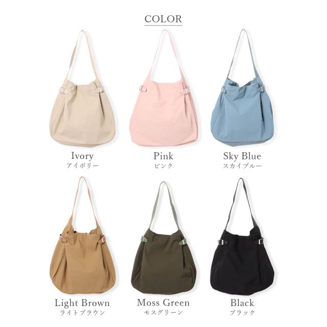 サラリとした肌触りのナイロンを使用し、タックフォルム&シルバーバックルで仕上げた大人かわいいトートバッグ。
