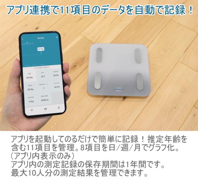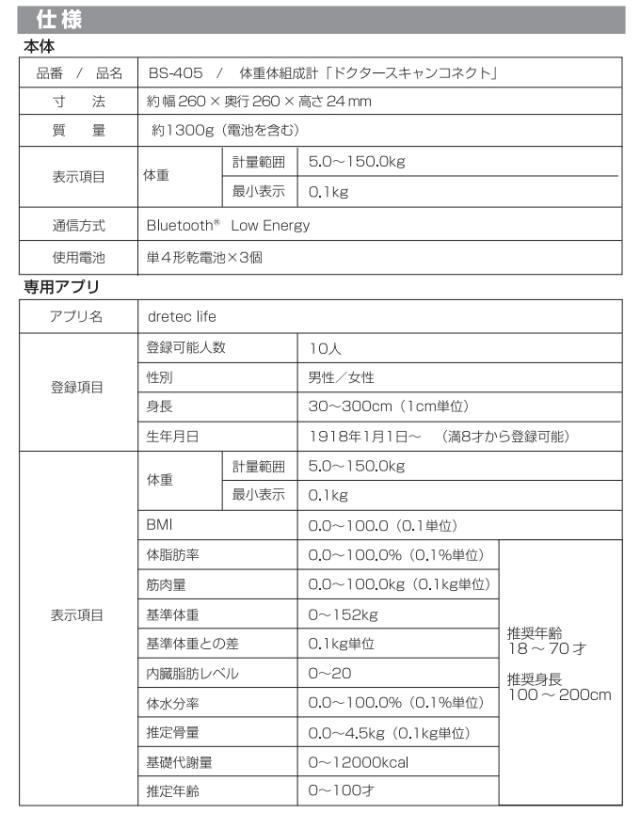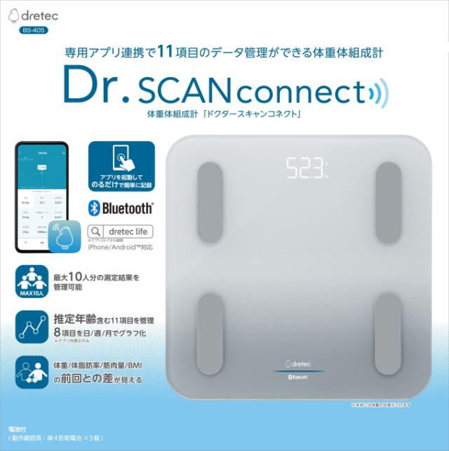体重体組成計 ドクタースキャンコネクト BS-405GY ドリテック ボディスケール 測る 計測 測定 シンプル 体重 体脂肪率 体水分率 筋肉量 推定骨量 基礎代謝量 内蔵脂肪レベル BMI 簡単 便利 自動電源 オシャレ 専用アプリ連携 送料無料