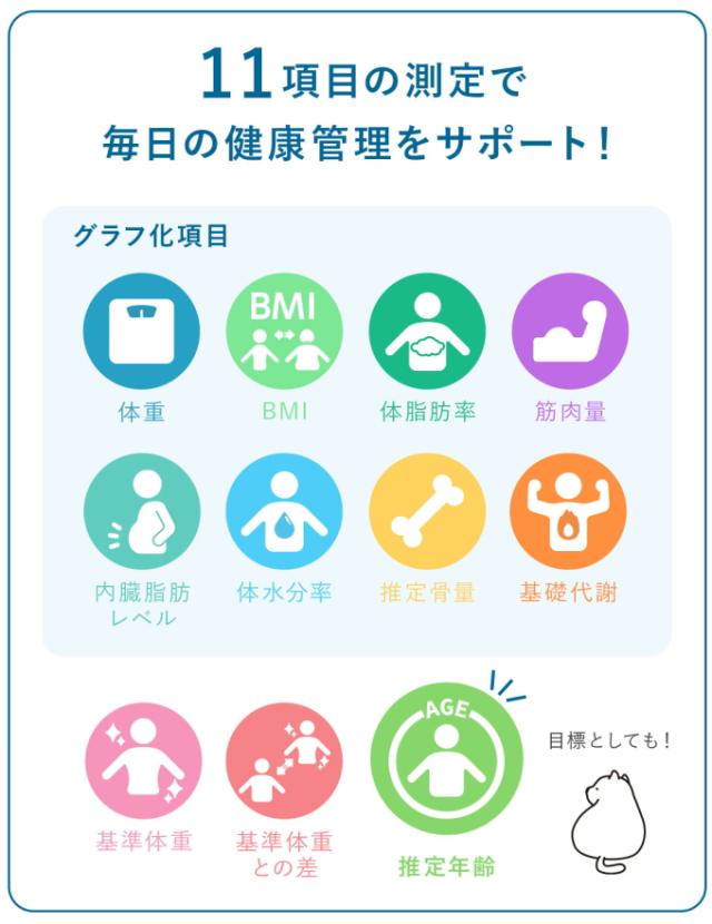 体重:計量範囲/5.0〜150.0kg 最小表示/0.1kg BMI:0.0〜100.0(0.1単位) 体脂肪率:0.0〜100.0%(0.1%単位) 筋肉量:0.0〜100.0kg(0.1kg単位) 基準体重:0〜152kg 基準体重との差:0.1kg単位 内臓脂肪レベル:0〜20 体水分率:0.0〜100.0%(0.1%単位) 推定骨量:0.0〜4.5kg(0.1kg単位) 基礎代謝量:0〜12000kcal 推定年齢:0〜100才 |
