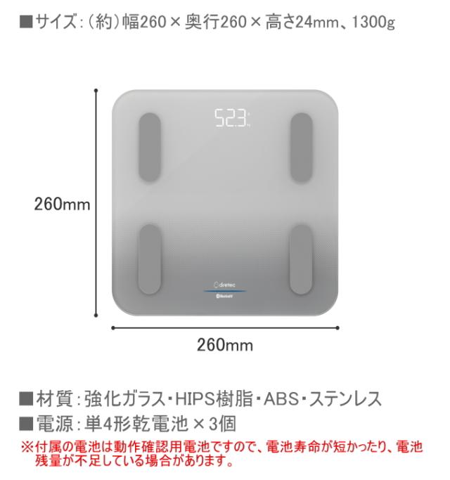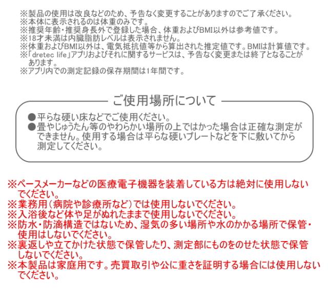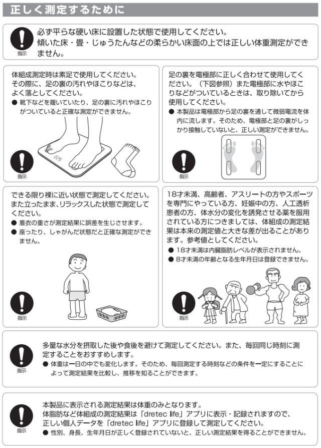 病院や診療所などでは使用しないでください。 業務用としての機能は備えておりません。業務用としては使用しないでください。 ペースメーカーなどの医療電子機器を装着している方は絶対に使用しないでください。 平らな硬い床などでご使用ください。 入浴後など、濡れた体で本製品に乗らないでください。 素足で使用してください。その際に、足の裏の水やほこりなどはよく落としてください。 付属の電池は動作確認用電池ですので、電池寿命は短い場合があります。 |