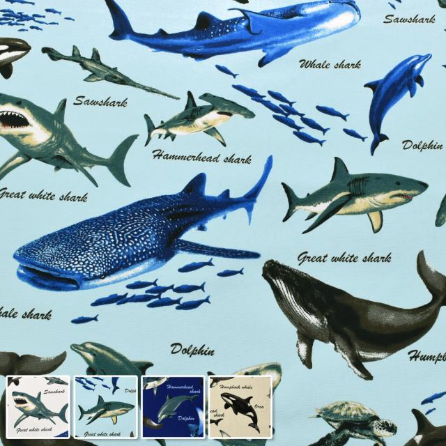 青い海の世界をリアルに描いた、コットンオックス生地。クールで人気なサメやクジラ、可愛らしい、シャチやイルカ、ウミガメなど、さまざまな海の生き物たちが泳ぐ姿が印象的なデザインです。英語で名前がプリントされたアニマル柄は、知的でスタイリッシュな雰囲気。ほどよい厚みのあるオックス生地は、レッスンバッグやポーチなどのハンドメイド作品にも最適。入園入学グッズにもぴったりで、キッズの持ち物をより特別なものにしてくれます。海の冒険を感じさせるようなかっこいいデザインと、クールな色合いが魅力的。見た目にも爽やかで、お子さまから大人まで楽しめる海洋生物柄のファブリックです。