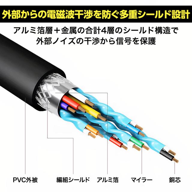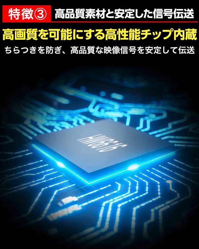 高画質・安定性の追求:フルHD対応。高性能チップ内蔵で映像のちらつきを防止。純銅芯線と4層多重シールド設計で外部ノイズの干渉を徹底ガードし安定した信号伝送を実現