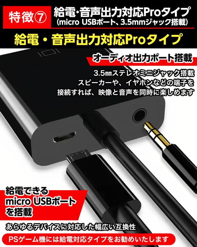 給電・音声出力対応Pro: microUSB給電ポート付き。安定した電力供給でPSゲーム機や長尺VGAケーブル(無制限)接続時にも安心