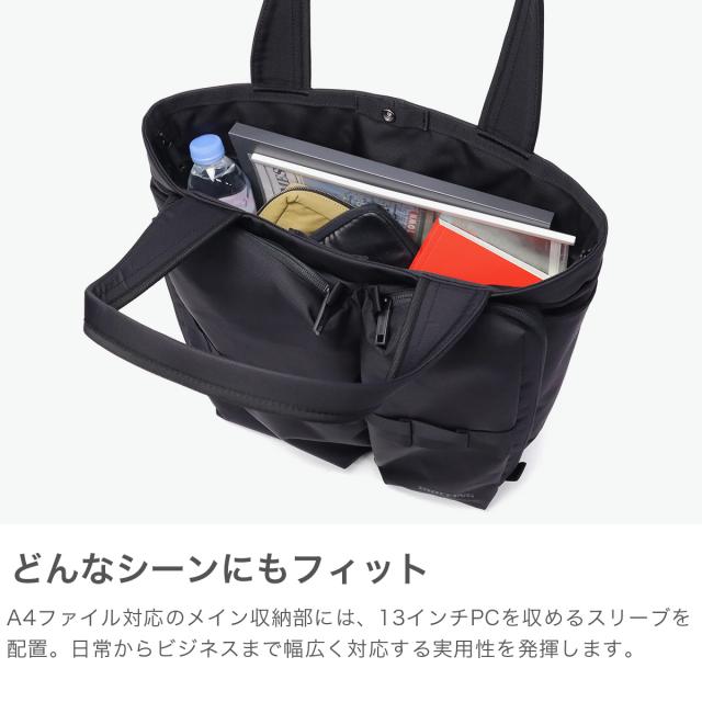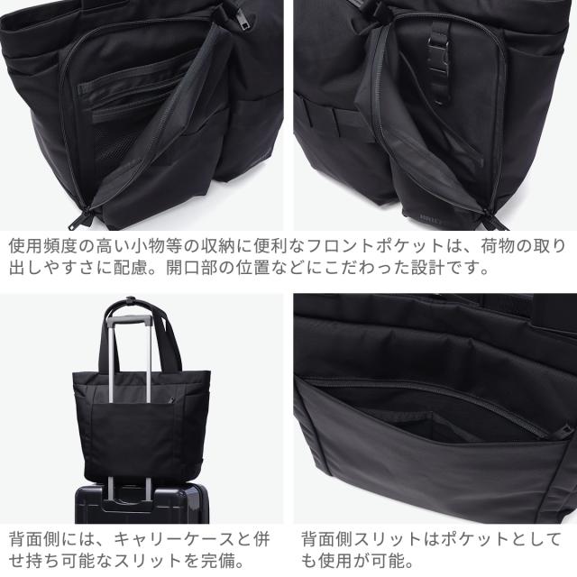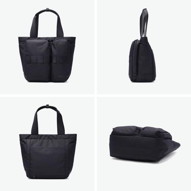 ウェビングテープの新アイコンを搭載した都会的でソリッドなコレクション『SOLID WAVE』のトートバッグ。オールブラックのカラーリング・極限までステッチワークを減らしたシームレスデザインが特徴的。ミニマルな佇まいが現代的で、肩掛けでも手持ちスタイルでもバランスがとりやすいアイテムとなっています。