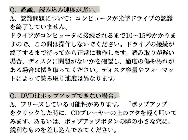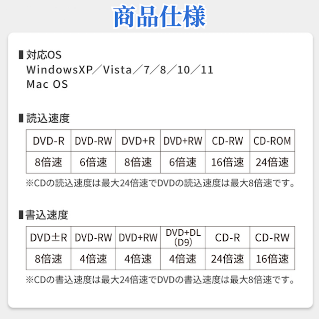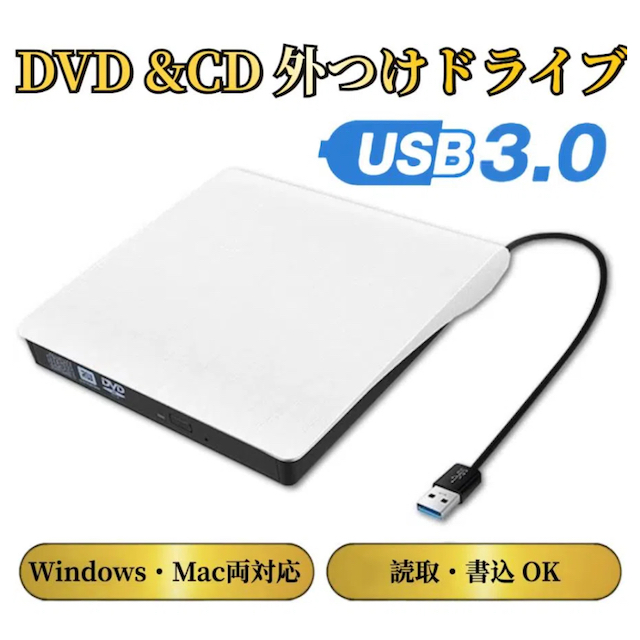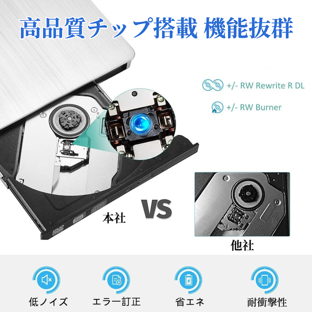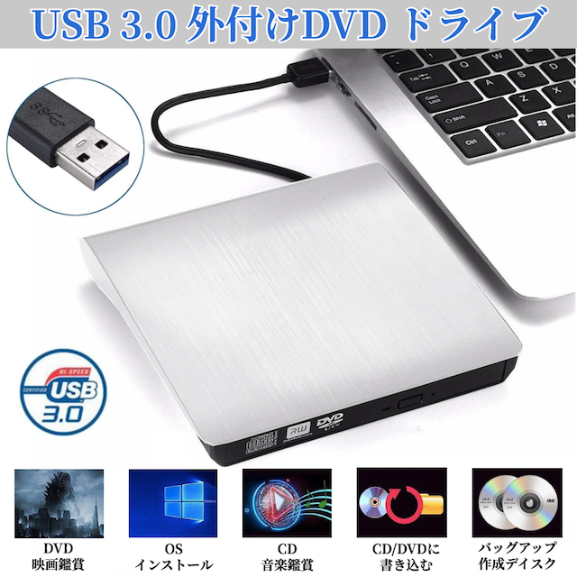 USB3.0 DVDドライブには、優れた書き込み技術が搭載されており、CD/DVD-rom、CD-R/RW、DVD±R/RWをサポートできます。最大8倍のDVD読み取り、8倍のDVD書き込み、24倍のCD読み取りと8倍のCD書き込みスピードを提供、 ファイルの書き込み、ソフトのインストール、ディスクバックアップの作成、DVDムービーの鑑賞などを対応してます。高級な材質を採用して作った高強度のボディーで、耐久、耐震、低騒音等の性能を持っています。