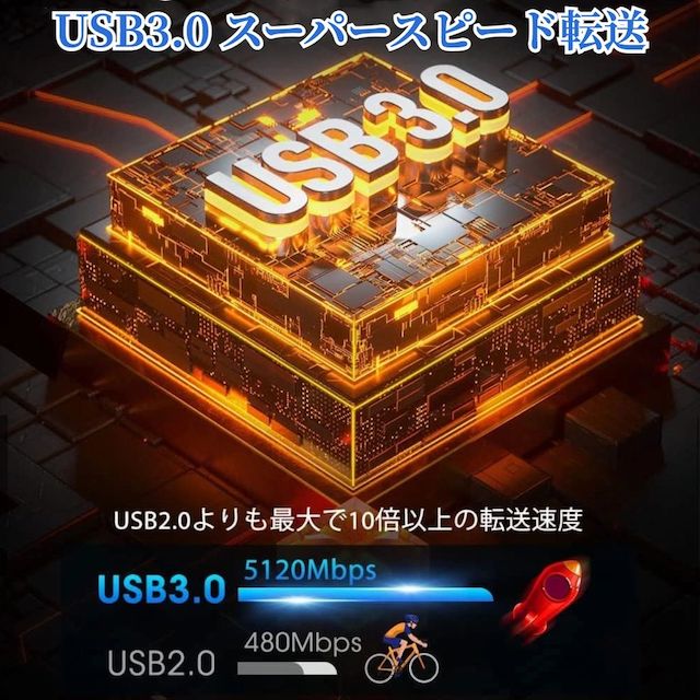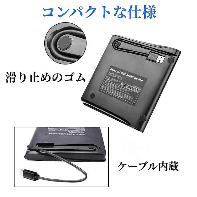 この外付けDVDドライブはUSB2.0と比べって、データの転送スピートは約10倍以上の最大5Gbps(640MB/s)の超高速 USB3.0を搭載するため、データ転送と読み込みスピードが更に速くなります。ドライブの底面にケーブルを収納できて、ケーブルを紛失する心配はなく、底は4つの滑り止めのゴムがあり、安定性が高いです。