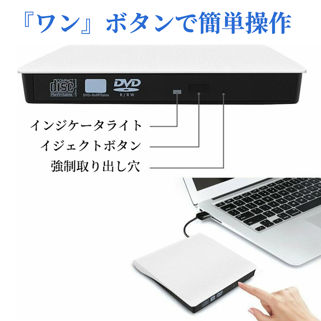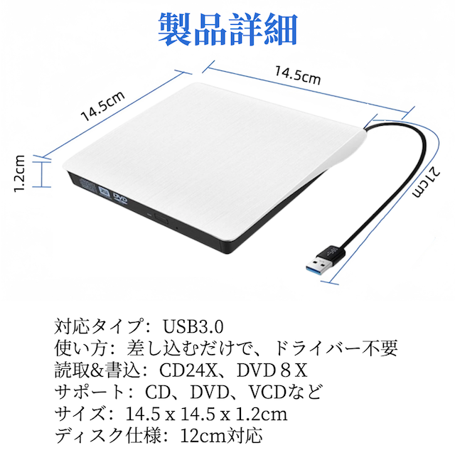 パソコンのUSBポートを差し込むのみで利用できる。外部ドライバーや電源は一切要りません。USBポートから給電ができるので、ACアダプターと外部電源必要がありません。サイズは14.5x14.5x1.2cmで、薄型コンパクトで、持ち運びに便利。注意:DVD / CDにデータを書き込む場合は、書き込み用のソフトが必要になりますので、プロの書き込みソフトをご利用してください。