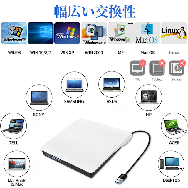 外付けのDVDドライブは、Windows11/Windows10/Win8/Win7/Win XP/Linux/MacOSシステムと互換性があります。内蔵ドライブのないラップトップ/デスクトップ/ Macbookに対応できます。本製品より DVDの映画鑑賞、ソフトのインストール、音楽の再生、ファイルの書き込み、ビデオなどをCD/DVDに書き込みなどをサポートできます。注意:デスクトップパソコンの場合、メインフレーム裏側にあるUSBポートと接続してください。