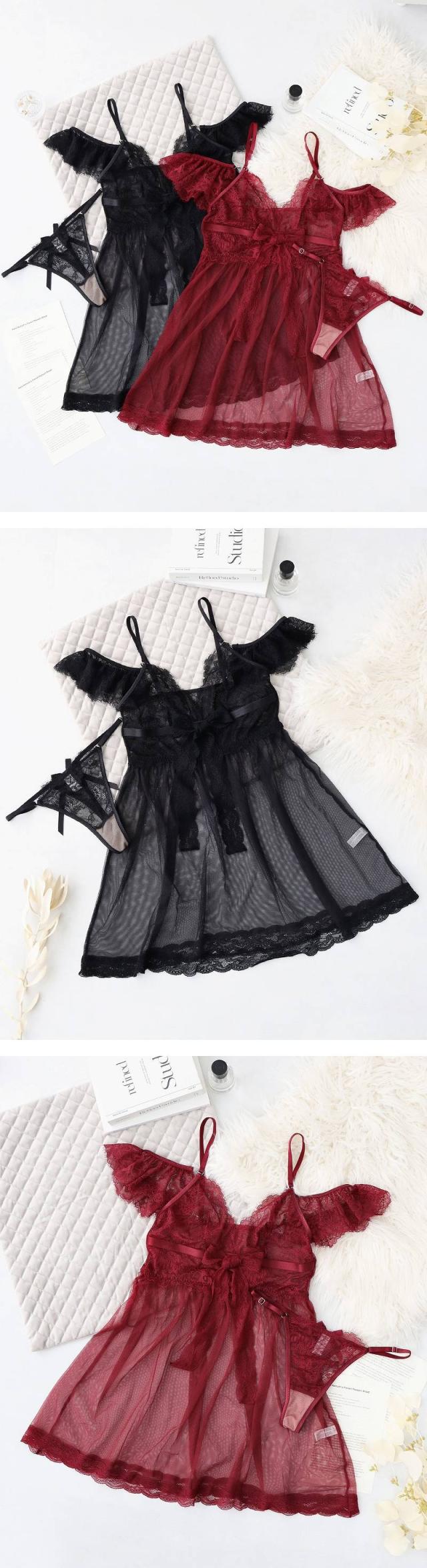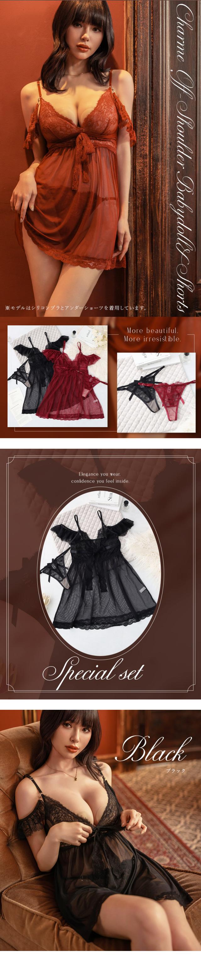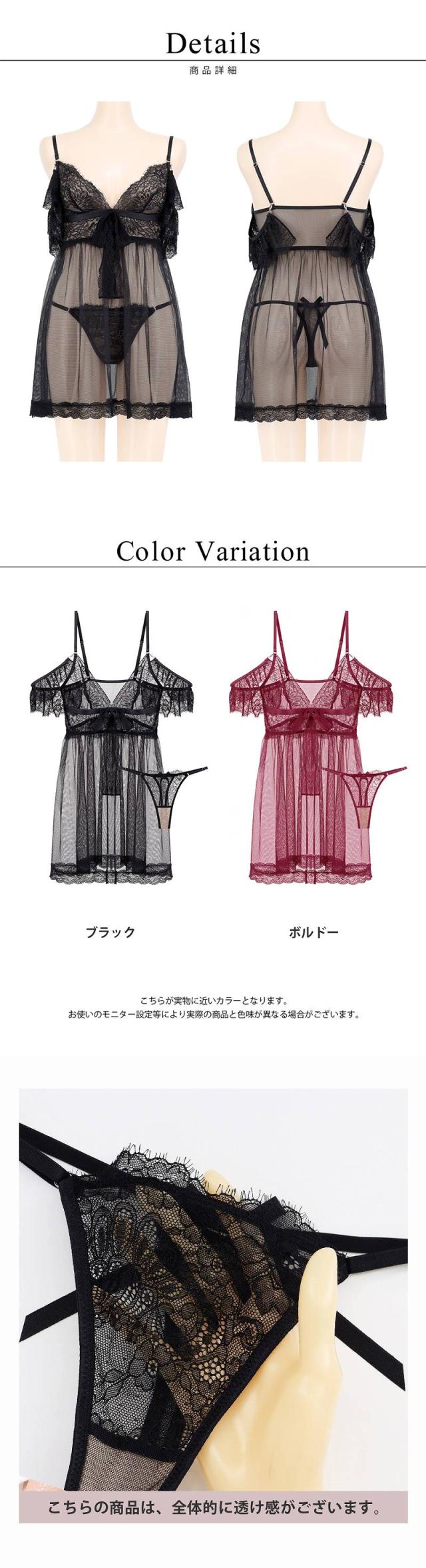 《adu》シャルムオフショルダーベビードール&バックリボンTバックショーツ セット ベビードール セクシー ランジェリー Tバック 透け シースルーレディースインナー【冬新作】