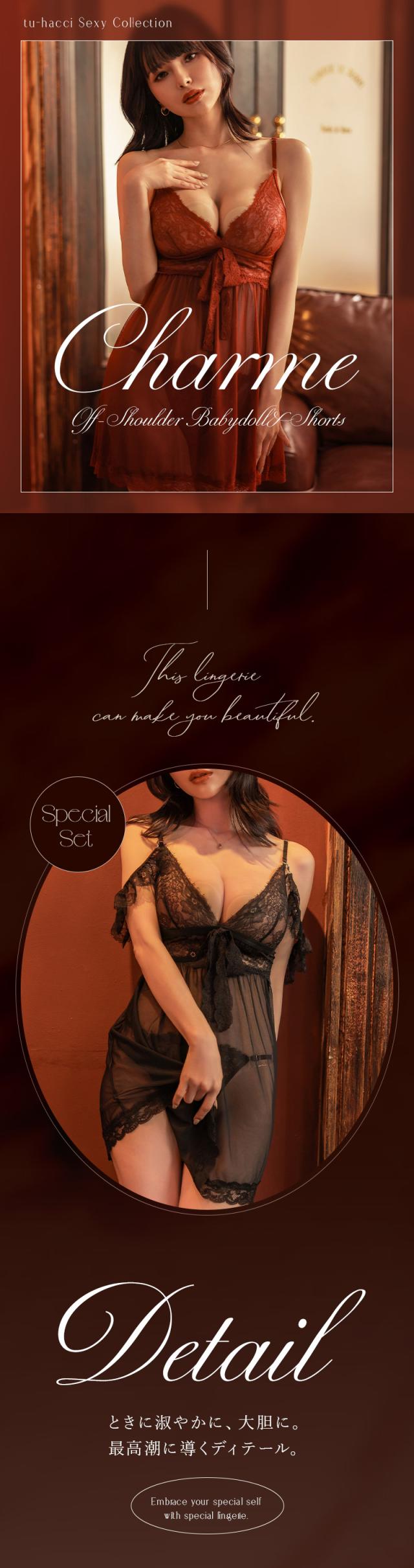 tu-hacci Baby doll&Shorts Collection ベビードール&ショーツ / 計2点セット 〜Aduシリーズ〜 『手軽に纏えるランジェリー』をコンセプトに生まれたスタイリッシュ&ラグジュアリーなLingerieシリーズです。 女性をより美しく魅せるワンランク上のセクシーランジェリーをお届けします。 ※Aduシリーズは透け感が特徴のデザインランジェリーです。 透け感の程度は商品により異なりますので、画像をご確認ください。 ■特別な1日を演出するノンパテッドタイプ 美しさと心地よさを叶える、こだわりのディティール。 カップは、ほんのり素肌が透けるレース仕様。 シアーなAラインチュールは、さりげなく体型をカバーしながらボディを彩る。 バックの軽やかなパワーネットが、心地よくフィットする一着。 袖のレースは取り外しも可能。 ■“非日常を纏う”ショーツ 専門店ならではの快適さを追求した設計とこだわりのデザイン。 センシュアルにヒップを彩る、魅惑のTバックタイプ。 フロントは透け感のある総レースで、サイドにはサイズ調整可能なアジャスター付き。 ≫ ギフトラッピングはこちら ≪ |