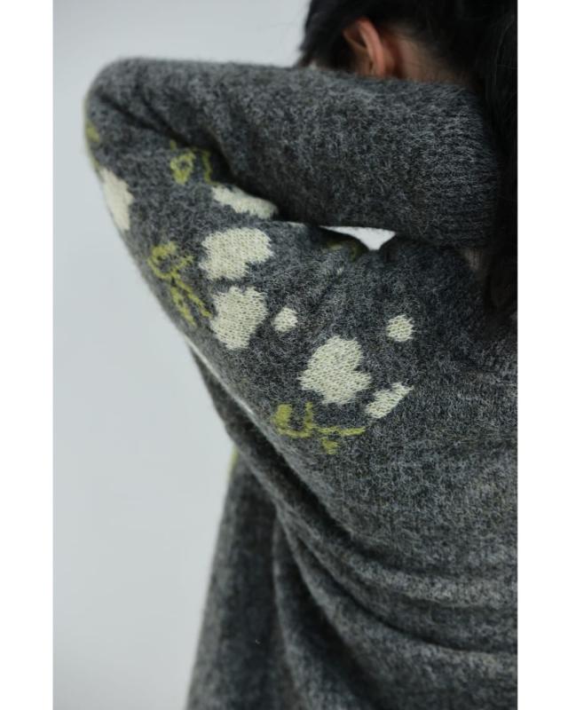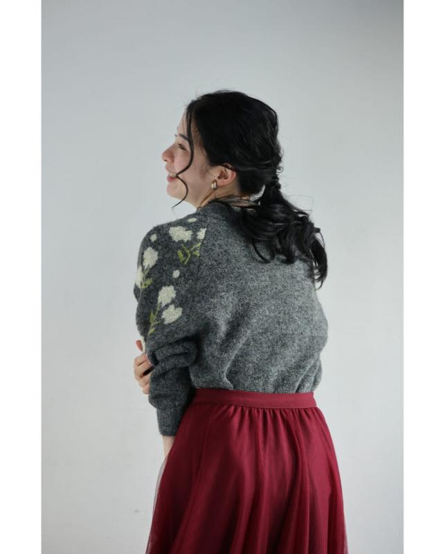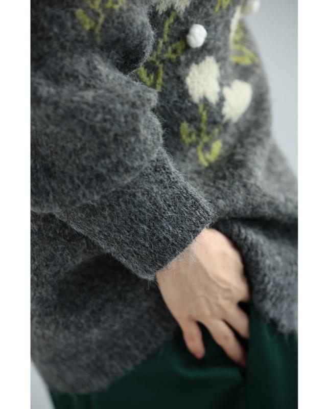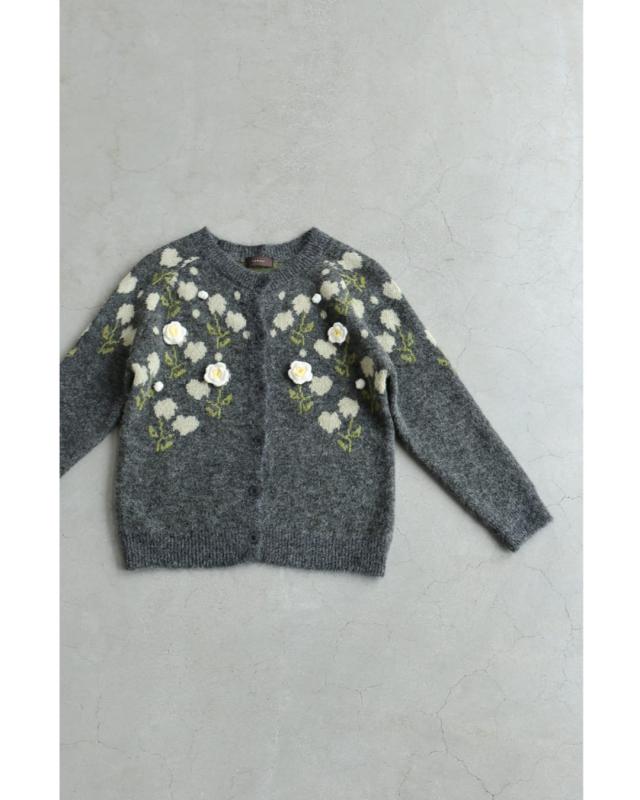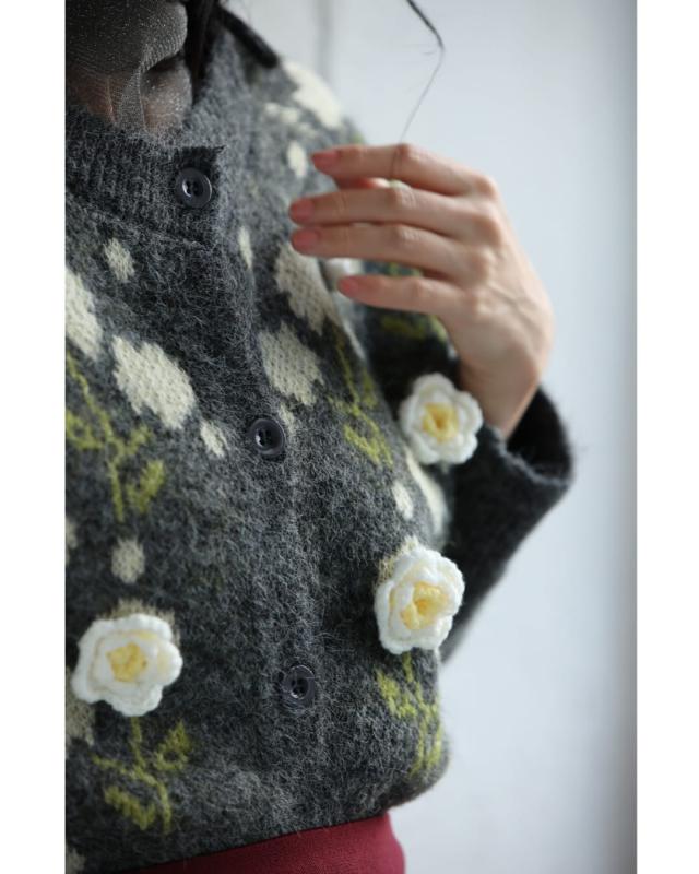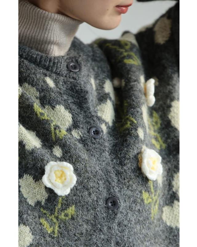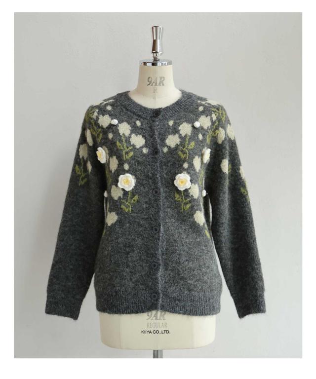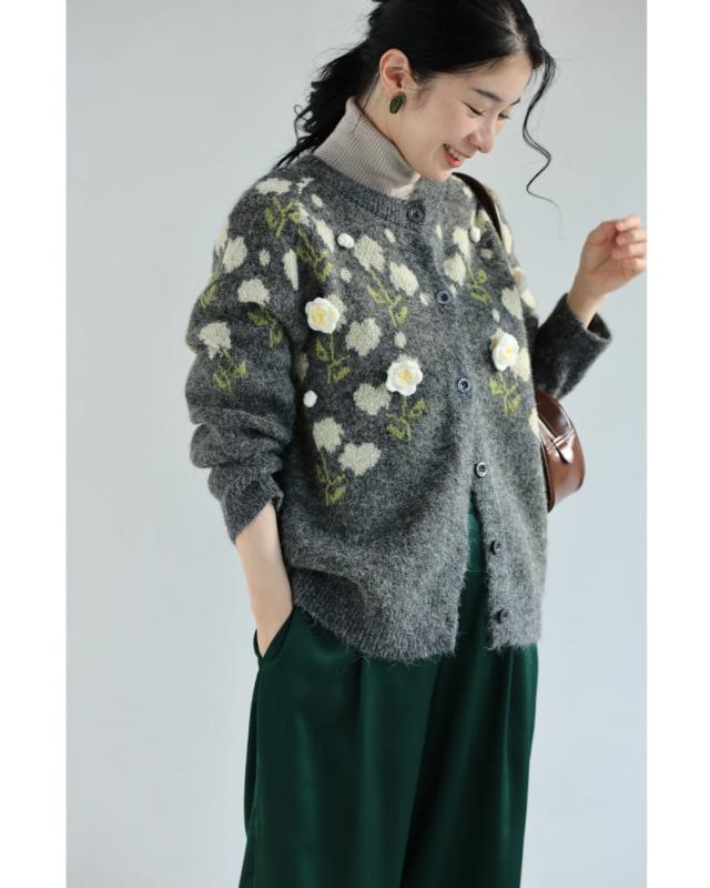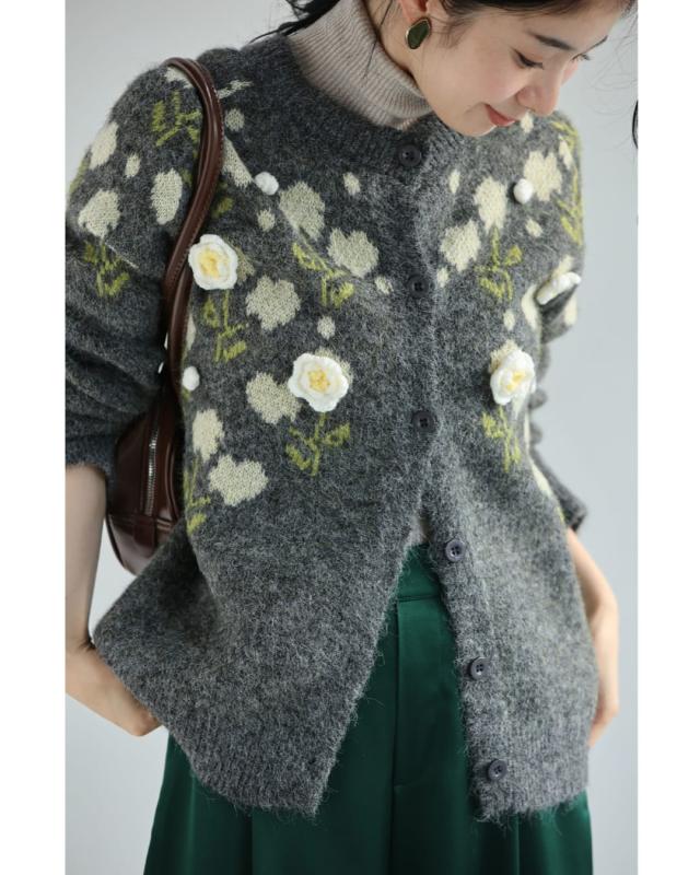 新作11月8日 浮き立つ花コサージュの起毛ニットカーディガン cawaii w61600ps S~3L対応 羽織り 前ボタン 長袖 花モチーフ グレー オシャレ 個性的 大人可愛い エレガント 上品 秋服 冬服 厚手 伸縮 レディース ファッション ミセス 30代 40代 50代