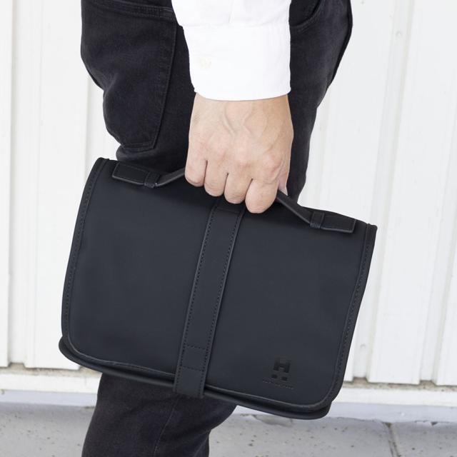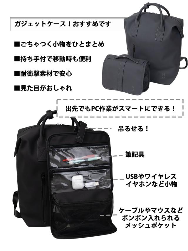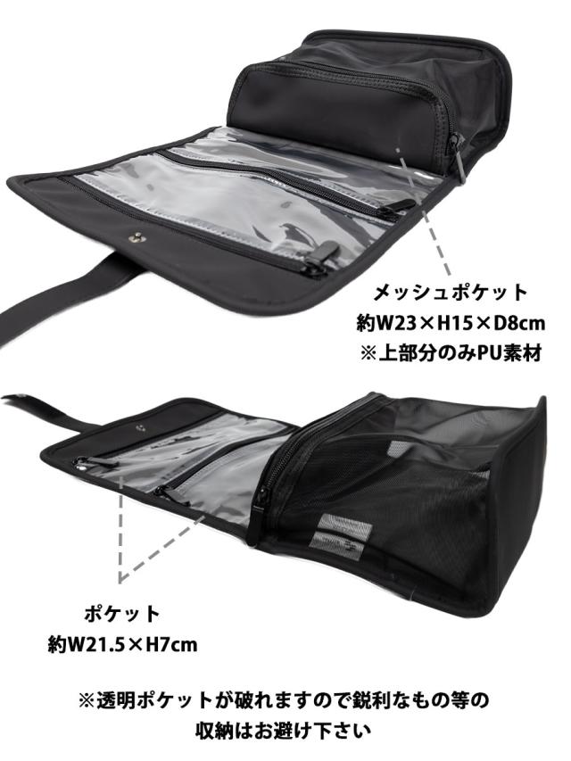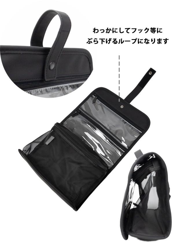 くるッと巻いて留めるループで吊るして使うことができます。2つの透明ポケットと大きめのメッシュポケットは視感性に優れていて旅先で使うアメニティやアクセサリー、家の中の小物収納、お仕事でのガジェット収納など、様々なシーンでお使いいただけます。