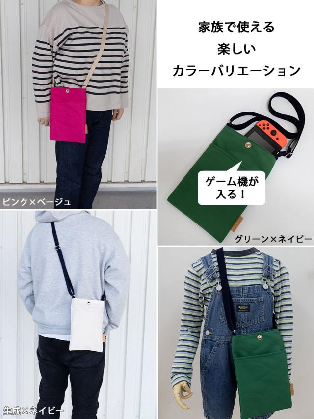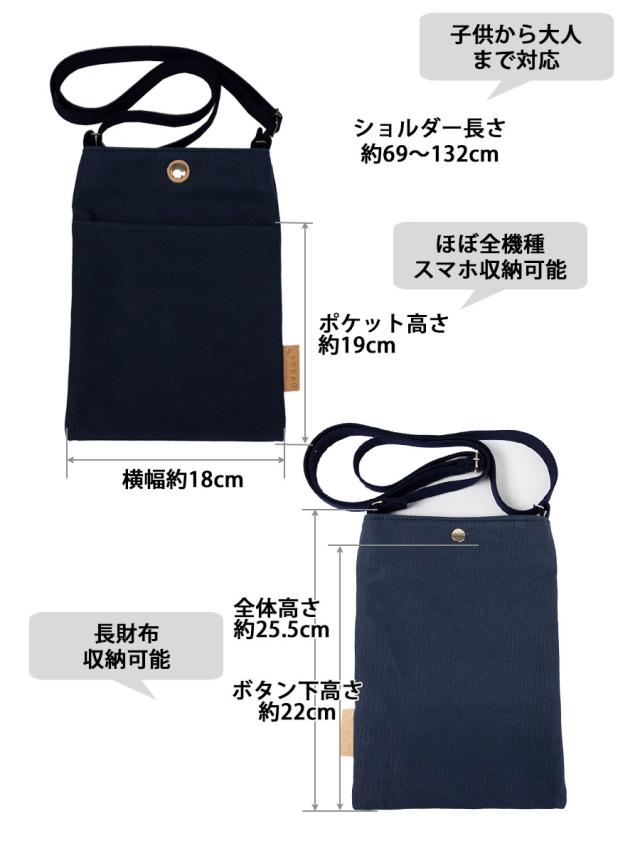 メイン層に長財布、前ポケットにスマホ、鍵は内ポケットに収納できます。ショルダーベルトは長さ調整可能なので子供から大人まで幅広くお使いいただけます。
