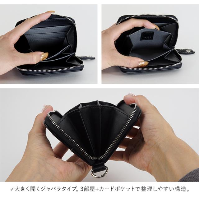 ラウンドファスナー仕様で大きく開き、中身が見やすく取り出しやすい設計。
