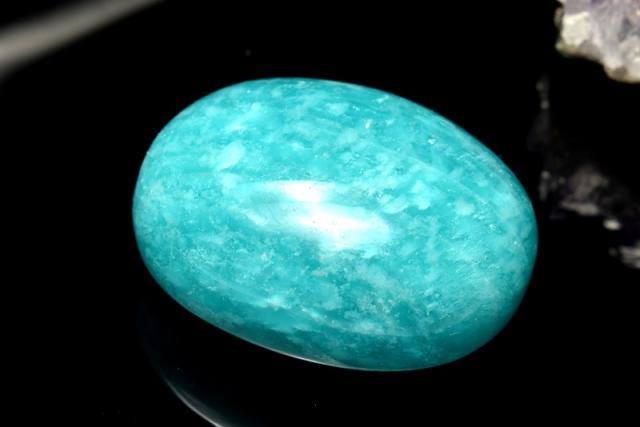 | 特徴・意味 | 高発色なブルーカラーで癒やしをもらえそうです。 ロシア産の特徴でもある霜降りのような模様が可愛らしいです。 アマゾナイトは英名はブラジルのアマゾン川に由来していますが、その流域では産出せず、アマゾン川流域で採れる色のよく似た石で、アマゾナイトと呼ばれていたものに由来しているようです。和名の天河石は、夜空のあまのがわに由来しています。 心を和ませてくれるような美しくやわらかな青緑色は、形成成分に含まれる鉛イオンによるものです。表面はガラス光沢か真珠光沢を放っており、四角柱状で産出することが一般的です。ほとんどが不透明で、ヒスイにも似た固体があり、それらはアマゾンジェードと呼ばれています。ヒスイの代用品として使われたこともあるようです。 |