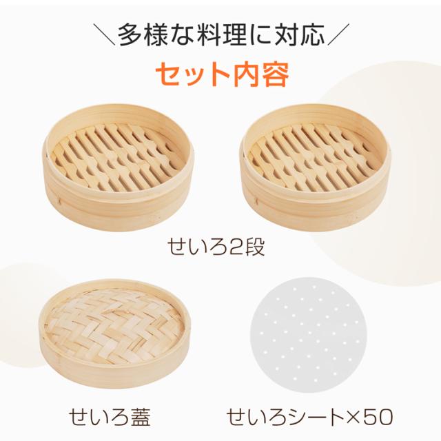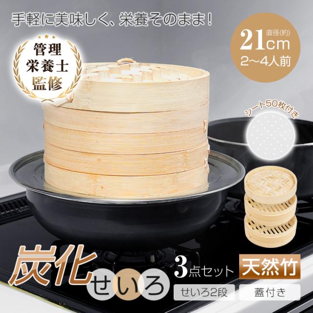 炭化加工せいろ シート50枚付 炭化 せいろ 中華 3点セット 蒸篭 2段 蓋 フタ 天然 竹製 セイロ 時短 健康 ダイエット 鍋 フライパン 蒸し器 蒸し料理 蒸しかご 蒸し野菜 温野菜 手軽 簡単 ヘルシー in069