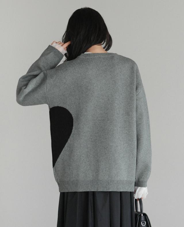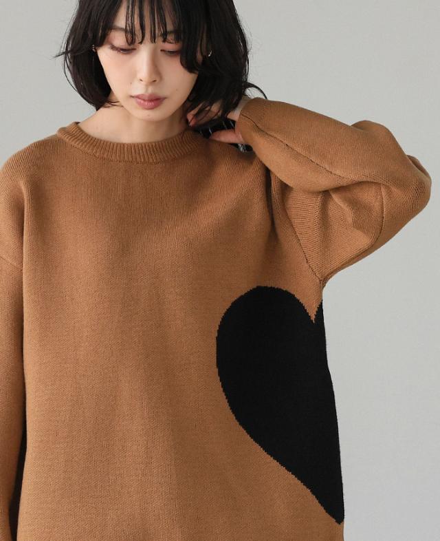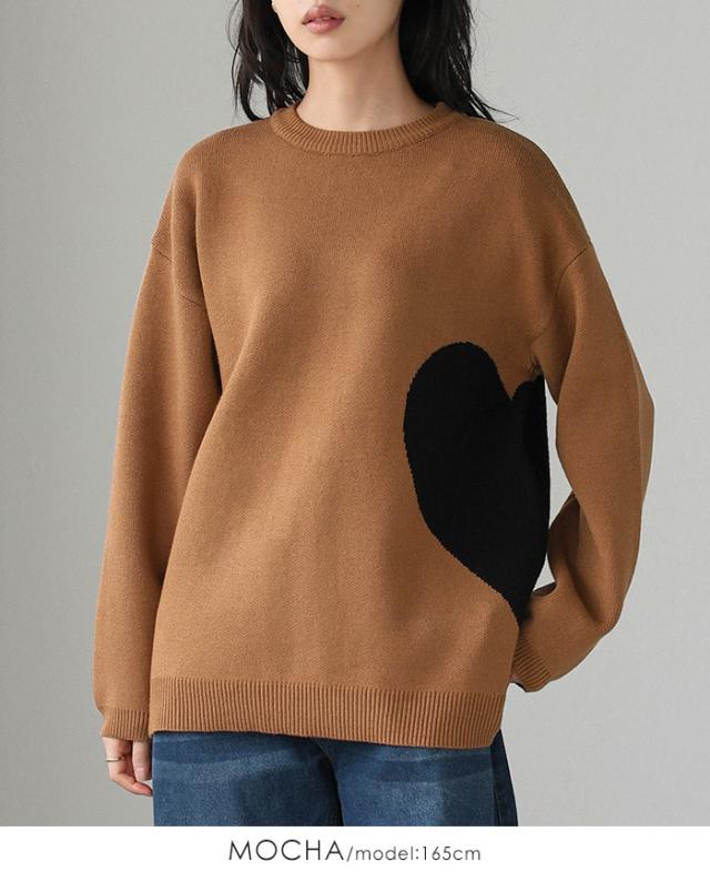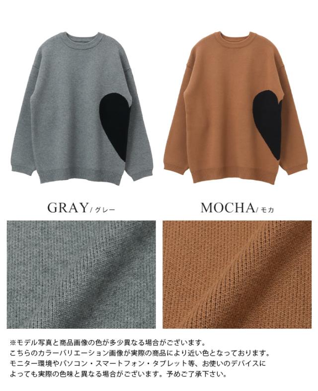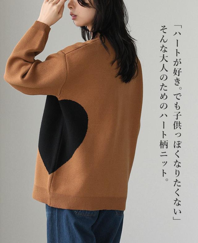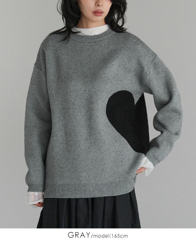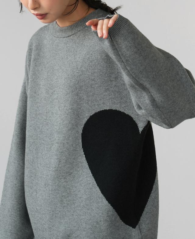 [新作限定P10%×送料無料]BIGハート柄ニット セーター レディース トップス 長袖 クルーネック 丸首 ハート 配色 体型カバー ゆったり 秋冬 秋新作 冬新作【メール便不可】