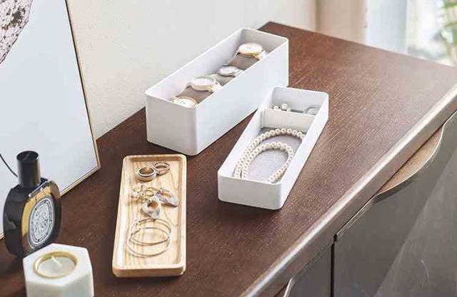 どんな場所にも綺麗に収まるスリム形状とデザインが嬉しい、 トレーとして使える木葢付きのシンプルなアクセサリー&時計ケース。 各ケースの底にはフェルトマットがついており、大事なアクセサリーや時計を傷つけず収納できます。 取り付け可能な仕切りと時計用のクッション付き。