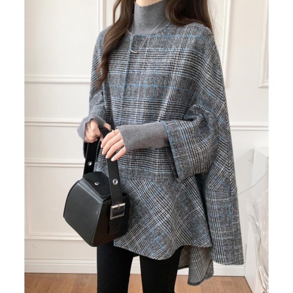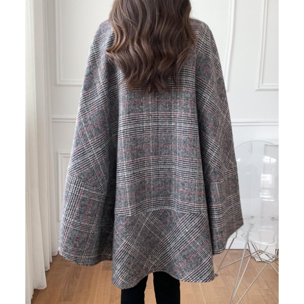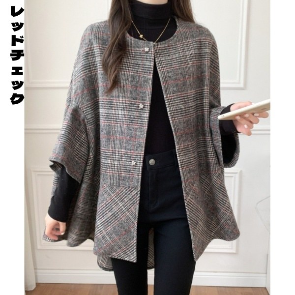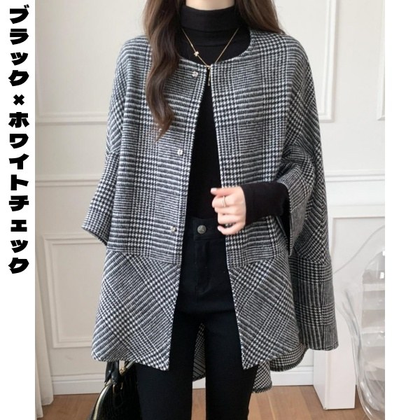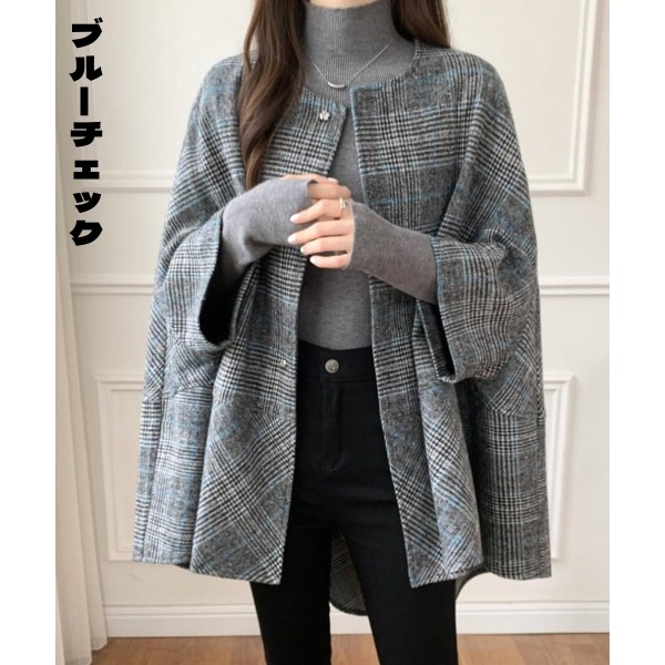 コート レディース ポンチョ風ケープデザイン ミドル丈 カーディガン アウター チェック柄 ウールブ 秋冬