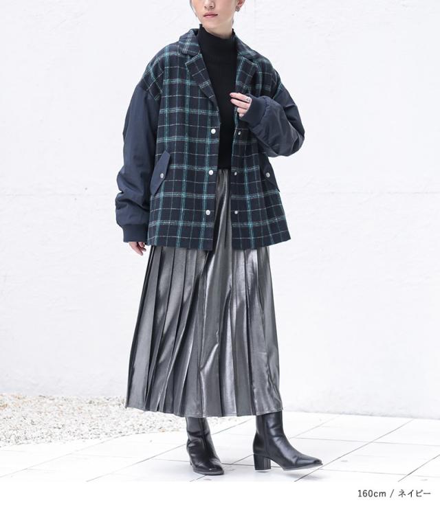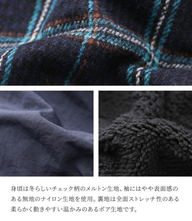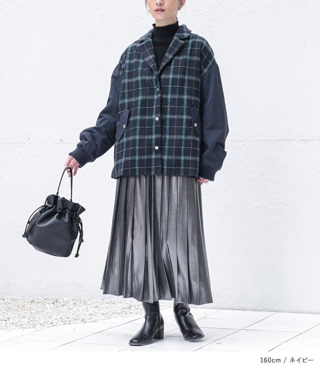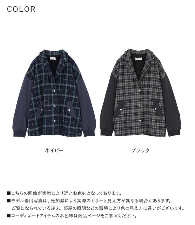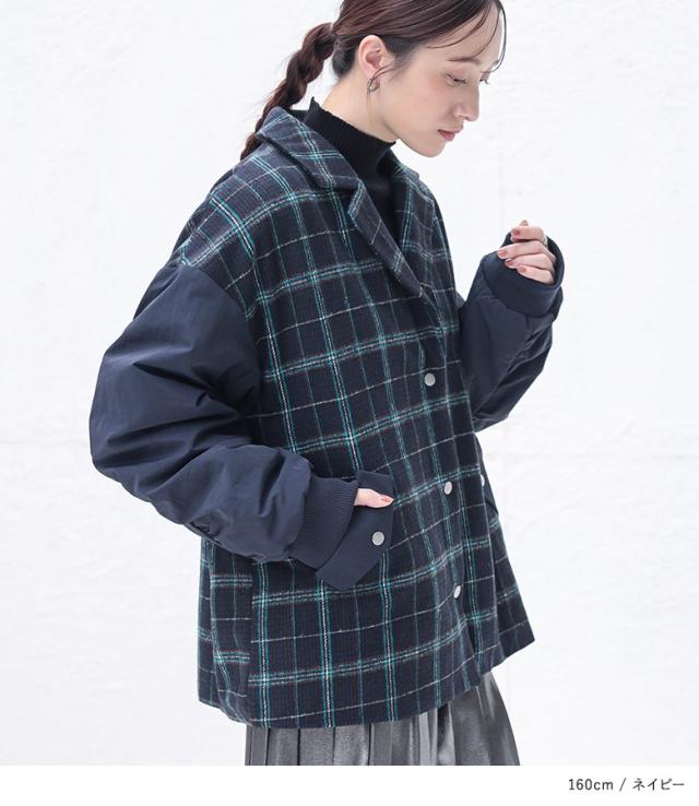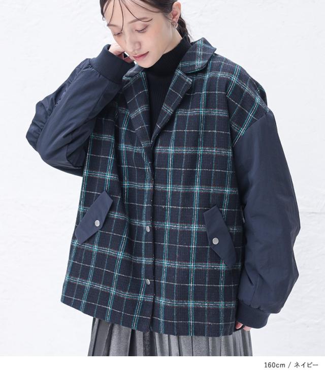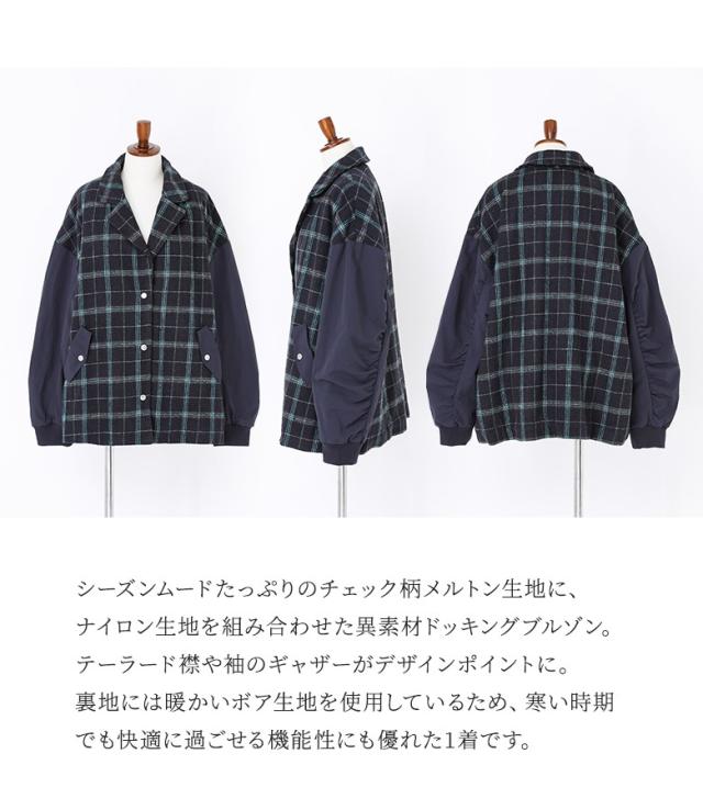 <冬新作>『異素材テーラードチェックブルゾン』【メール便不可】【50】[ブルゾン 長袖 レディース アウター テーラード襟 ジャケット 裏ボア 異素材 切替 チェック柄 ギャザー袖 あったか 秋 冬]