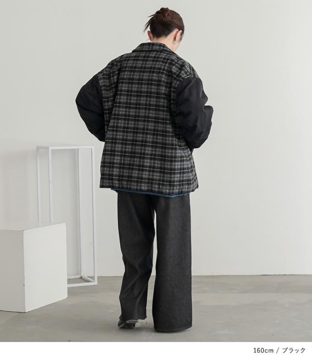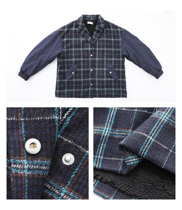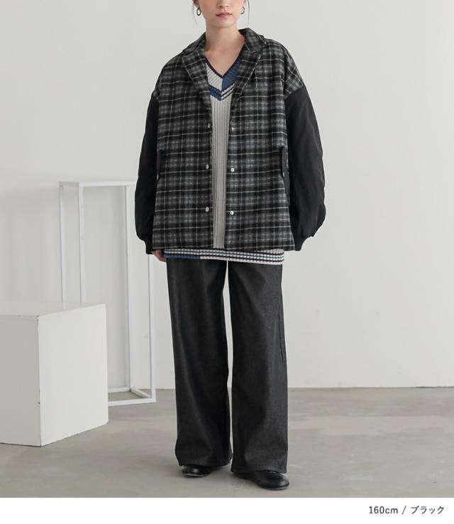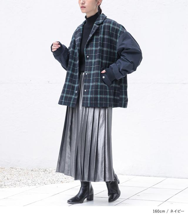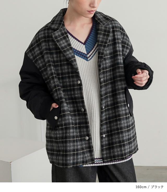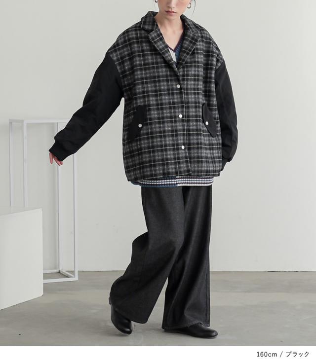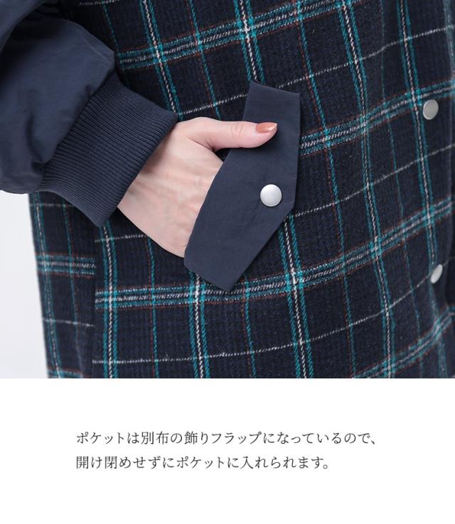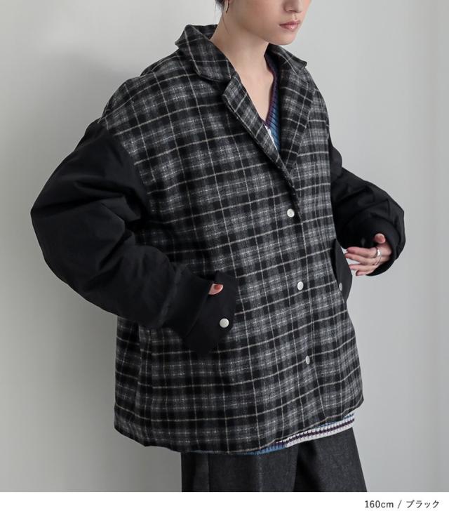 <冬新作>『異素材テーラードチェックブルゾン』【メール便不可】【50】[ブルゾン 長袖 レディース アウター テーラード襟 ジャケット 裏ボア 異素材 切替 チェック柄 ギャザー袖 あったか 秋 冬]