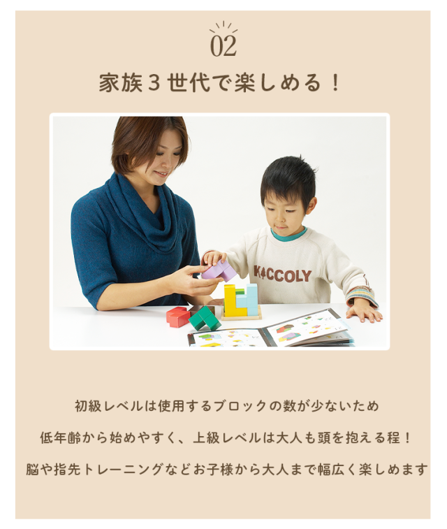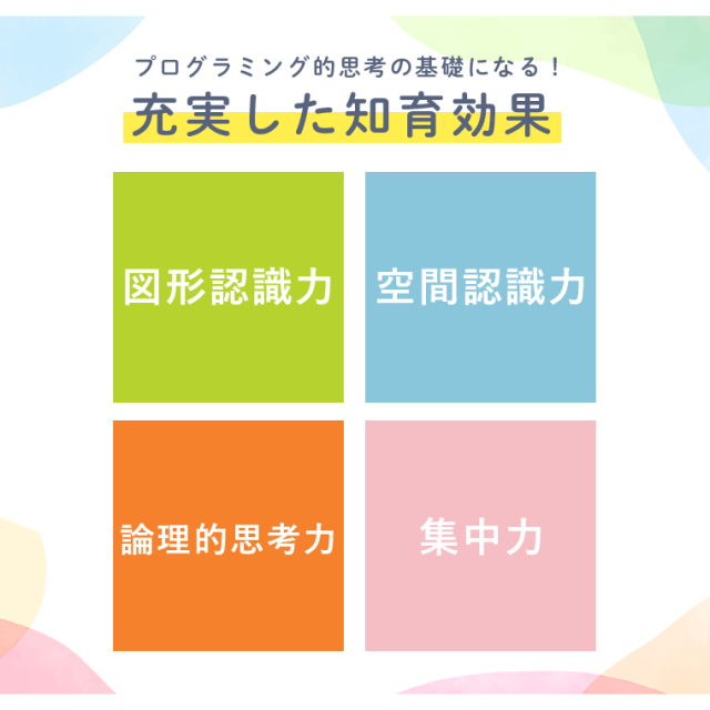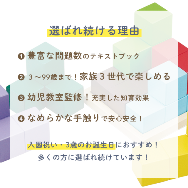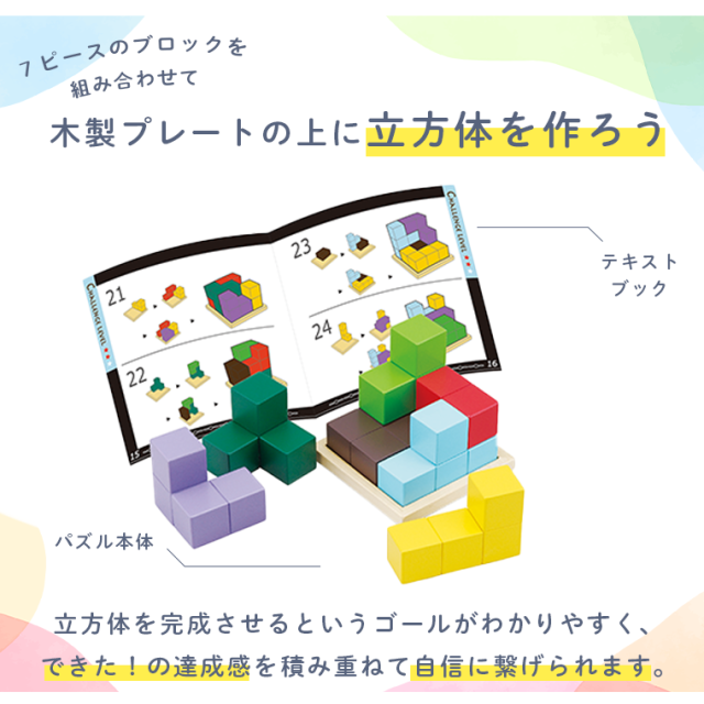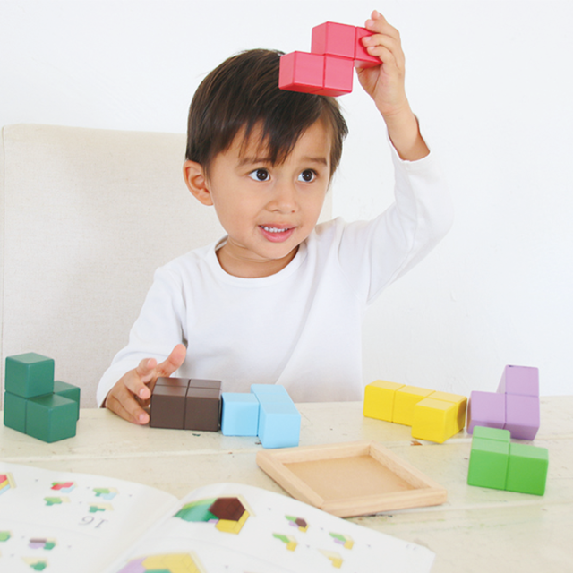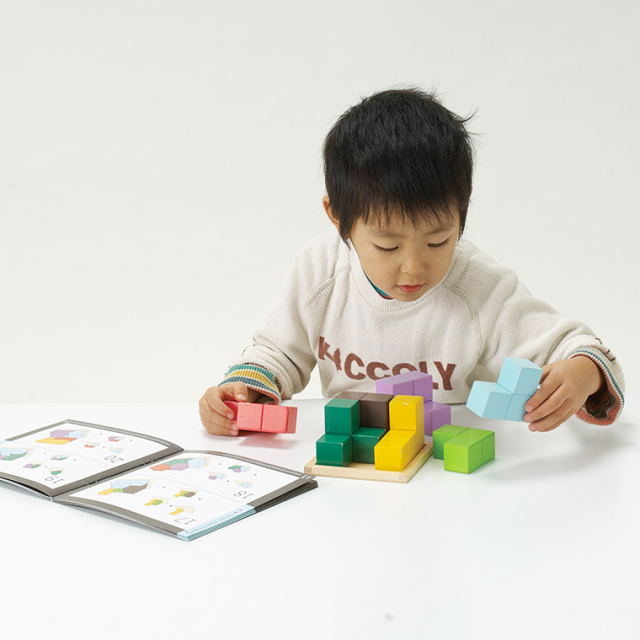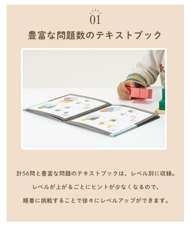 全部で56種類の問題を収録したテキストブック付きです。ゴールが分かりやすいので取り組みやすく、遊びのなかで図形認識や空間認識力が高まります。