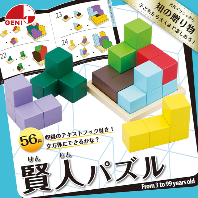 「賢人パズル」は、7つのブロックを組み合わせて立方体を完成させる脳トレパズル。