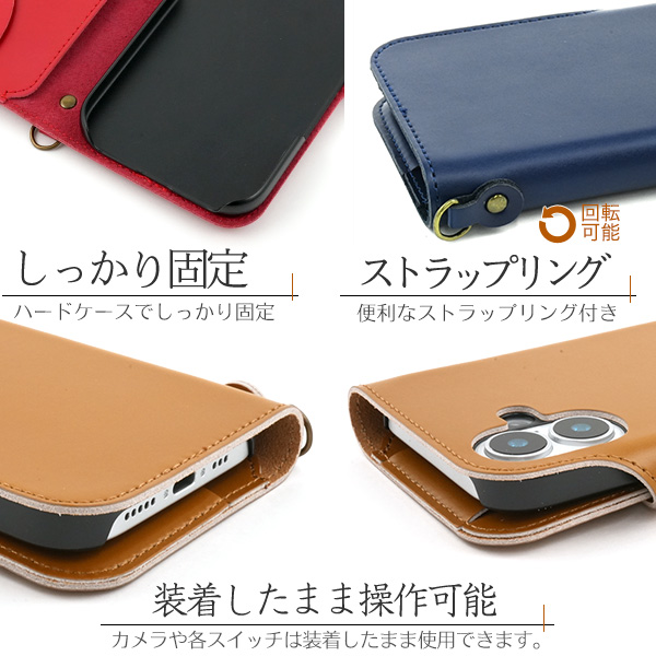 | 上質な牛革を全面に使用した、牛革手帳型ケース。 美しい質感と滑らかな触り心地の牛革を使用しています。 一つ一つ丁寧に制作しています。 実用新案登録済のカード落下防止フラップ付き! 逆さにしてもカード落下の心配がありません。 大切なカード収納時やネックストラップ使用時などに最適です。 内部ケースはハードケースなのでしっかりとスマートフォンを固定できます。 横開きタイプなので、手帳のように使うことができます。 また、内側にはカードポケット2つとフロント/サイドポケットが付いています。 しっかりと固定できるマグネット式スナップボタンを採用しています。 便利なストラップリング付きで、ストラップなどを装着可能です。 | ||||||||||||||