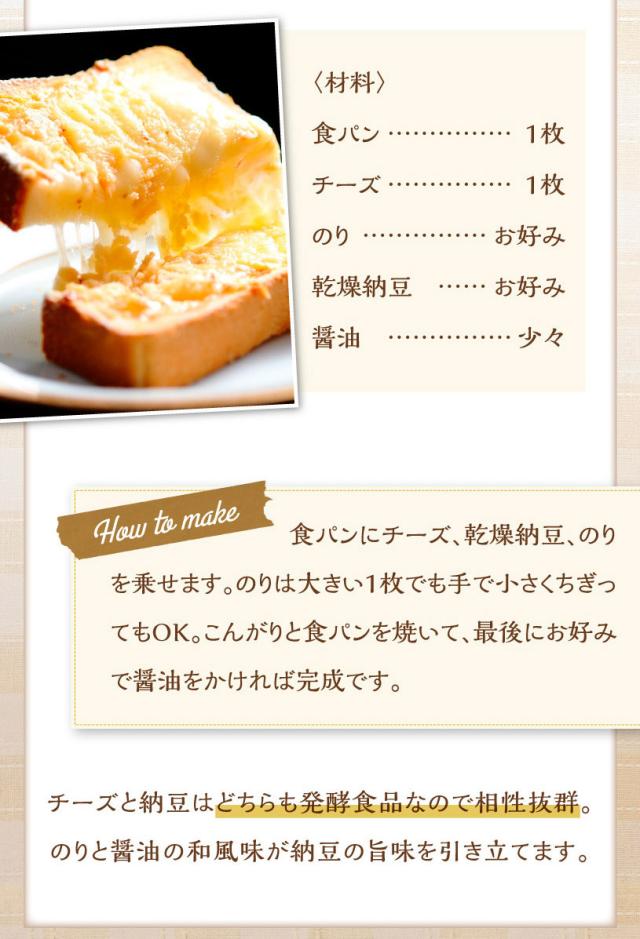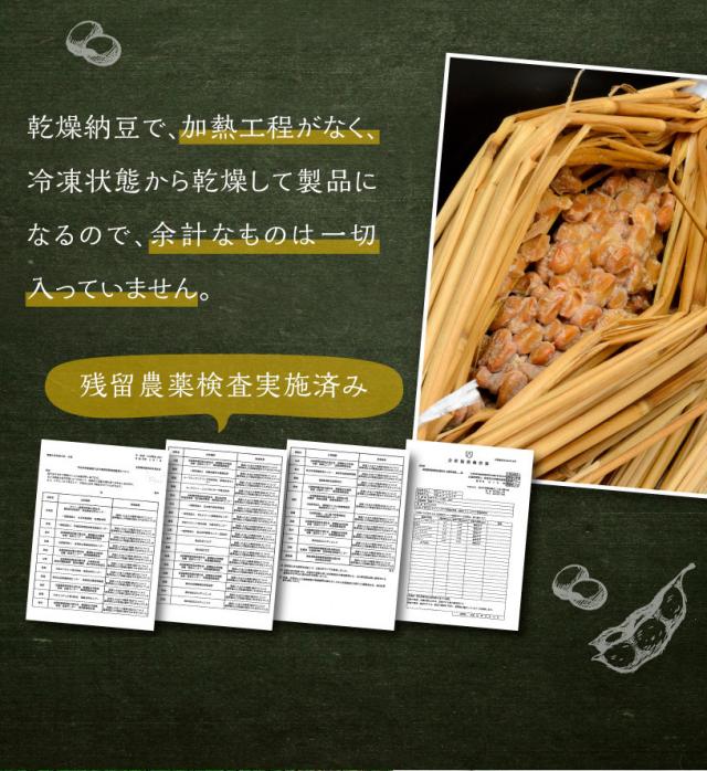 国産大豆使用、残留農薬検査実施済み、納豆菌が1gに93億個、ナットウキナーゼ活性・大豆イソフラボンアグリコン含有