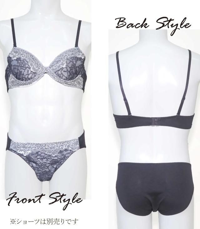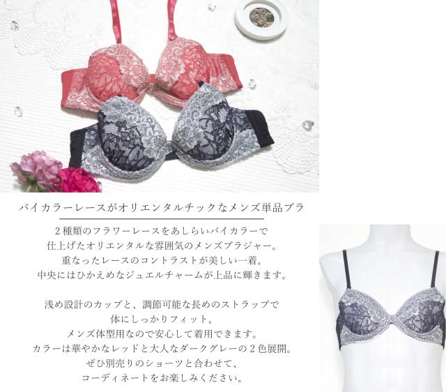2種類のフラワーレースをあしらいバイカラーで仕上げたオリエンタルな雰囲気のメンズブラジャー。