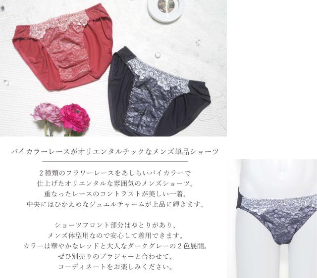 バイカラーのフラワーレースが華やか。ジュエルチャームが上品に輝く、オリエンタルな雰囲気のメンズ用ショーツ。ゆとりのあるフロント設計で快適な履き心地◎