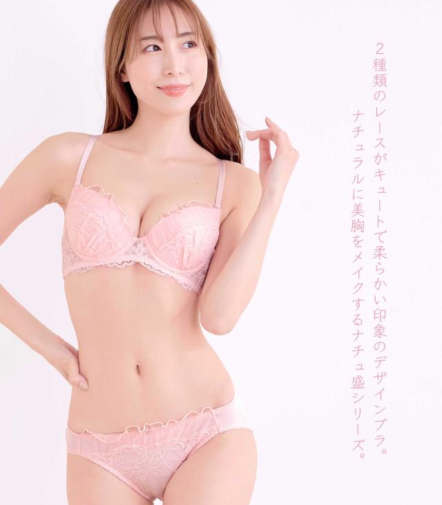 清楚で可愛らしい雰囲気をまとう、柔らかなカラーが魅力なブラセット。自然なバストを叶える「ナチュ盛」カップに、安心のフルバックショーツ付き。