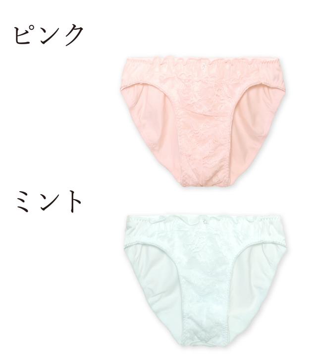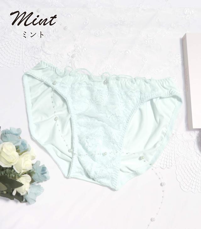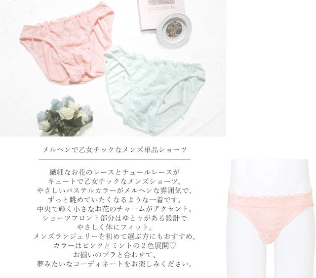 繊細なお花のレースがとチュールレースがキュートで乙女チックなメンズ用ショーツ。ピンクとミントのパステルカラーがメルヘンな雰囲気でユメカワイイ。フロント部分はゆとりのある設計。
