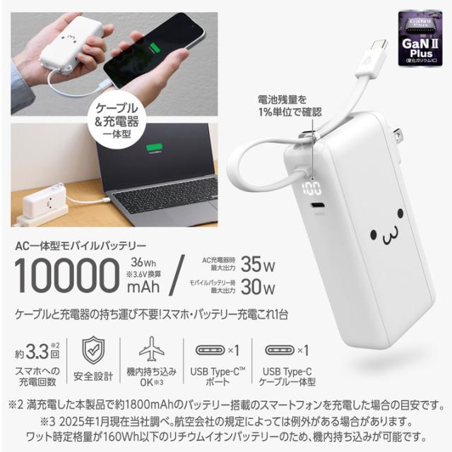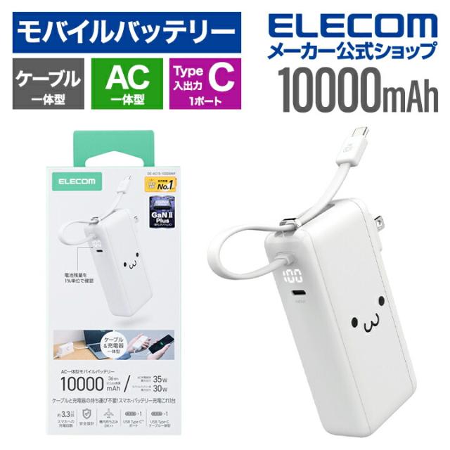 エレコム モバイルバッテリー AC充電器 USB Type-C ケーブル一体 10000mAh 35W リチウムイオン電池 AC一体型 充電器 残量表示 USB-C×1 しろちゃん┃DE-AC15-10000WF