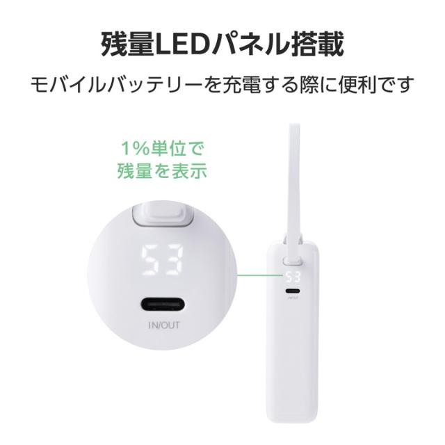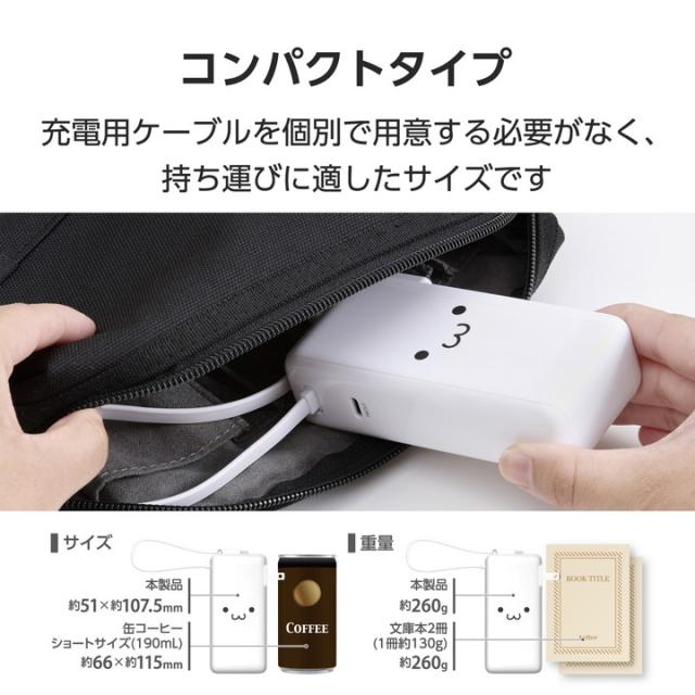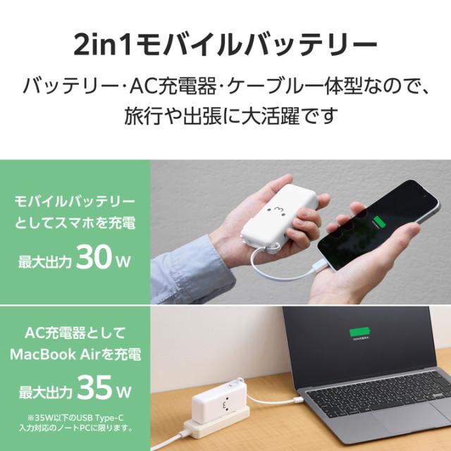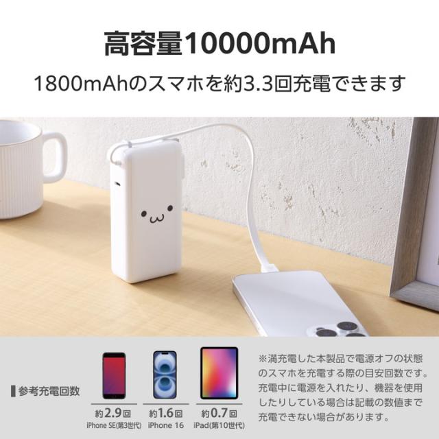 AC充電器としても使える2in1タイプのモバイルバッテリーです。10000mAhの大容量にUSB Type-C(TM)ケーブルが一体化されているため、外出先でも安心して充電できます。バッテリー残量はLEDパネルで1%単位で確認できます。USB Power Delivery対応です。かわいいしろちゃんモデルです。![]() ■AC充電器と、USB Type-C(TM)ケーブルを一体化したモバイルバッテリーです。USB Power Delivery対応です。 ■バッテリー・AC充電器・ケーブル一体型なので、旅行や出張に大活躍。これひとつでお出かけの際も持ち運べます。 ■モバイルバッテリー使用時は、USB Power Deliveryにより最大30Wでスマートフォンを高速充電できます。外出先の急な充電切れにも安心です。 ■本製品をコンセントに挿した状態でスマートフォンを接続することで、AC充電器として使えます。 ■一体型ケーブルに加えて、USB Type-Cポートを1つ搭載しています。USB Type-Cポートに別売のケーブルを接続することで、2台のスマートフォンなどを同時に充電可能です。 ■※AC充電器として使用する場合は計18W、モバイルバッテリーとして使用する場合は計20Wを2台に電力分配して充電を行います。 ■AC充電器として、USB Power Deliveryによる最大35W出力に対応。スマートフォンやタブレットはもちろん、MacBook Airなどのノートパソコンにも充電可能です。 ■※AC充電器として使用し、35W以下のUSB Type-C入力に対応したパソコンに限ります。 ■USB Power DeliveryおよびPPS規格に対応。機器に応じて電圧、電流が変化するため、幅広い機種を充電できます。 ■※USB Power Deliveryとは、アダプターと接続機器間で情報をやり取りすることで、その機器間における最適な電力を選択し、高速充電を実現するUSB規格です。 ■※PPS(Programmable Power Supply)とは、0.02V単位で電圧を調整し、最適な電力で効率的に供給することができるUSB Power Deliveryのオプション規格です。 ■※USB Type-Cポートまたは一体型USB Type-Cケーブルを単独で使用した場合、AC充電器として使用時PD最大35W/PPS最大30W、モバイルバッテリーとして使用時PD最大30W/PPS最大30Wとなります。 ■スマートフォンなどへの充電と、本製品への充電も同時に行える“まとめて充電”に対応しています。 ■※スマートフォンへ優先的に充電されます。 ■※本製品はパススルー充電に対応しており、バッテリーを介さずに充電器から接続機器へ直接充電するため、電池の劣化を抑えられます。 ■コンセントに挿すだけで本製品を充電できます。充電時間は約2時間です。 ■※本製品のみを充電した場合の目安時間です。 ■電源プラグ部分にはスイングプラグ機構を採用。回転させて本体に収納できるためスマートに持ち運べます。 ■本製品(バッテリー容量10000mAh)で、1800mAhのスマートフォンを約3.3回、3000mAhのスマートフォンを約1.9回充電可能です。 ■※満充電した本製品で電源オフの状態のスマートフォンを充電する際の目安回数です。充電中に電源を入れたり、機器を使用したりしている場合は記載の数値まで充電できない場合があります。 ■LEDパネルでバッテリー残量を1%単位で確認しながら使えます。事前にモバイルバッテリーを充電する際などに便利です。 ■NINTENDO SWITCH(TM) 2/NINTENDO SWITCH(TM)/NINTENDO SWITCH Lite(TM)対応です。 ■※ドックでのご利用に対応しておりません。 ■GaN II Plus(窒化ガリウム)ICを採用し、高出力ながら製品の小型化及び軽量化を実現しました。 ■一般的なモバイルバッテリーの約2倍となる、約1000回繰り返し使える、長寿命な充電式リチウムイオン電池を搭載しています。 ■内蔵の充電式リチウムイオン電池は、JIS C 62133-2:2020およびJIS C 8715-2:2024に準拠した安全設計です。 ■日本の電気用品安全法(PSE)の技術基準に適合した安全性の高い商品です。 ■Thermal Protectionを搭載し、製品温度の上昇を監視・制御。自動で出力をコントロールし、お使いの機器を守ります。 ■過充電・過放電・過電流防止機能および短絡保護機能と温度検知機能の5つの保護機能を備えた安心の回路設計です。 ■電池容量が160Wh(43,243mAh)以下であるため、機内持ち込みも可能です。 ■※航空会社の規定によって例外がある場合があります。 ■※工場出荷時に70%程度充電されています。充電式リチウムイオン電池は時間とともに放電するので、ご使用になる前に充電することを推奨します。 ■※USB Type-Cポートにケーブルを挿したままにすると、バッテリーの残量が減ってしまいます。使用しない場合は必ずケーブルを外してください。 ■※本製品とスマートフォンを接続するケーブルは付属していません。 ■※USB Type-C and USB-C are trademarks of USB Implementers Forum. ■本製品は、一般社団法人JBRCの回収対象製品であり、回収協力自治体や協力店(家電量販店・ホームセンターなど)で回収が可能です。 ■※JBRCのホームページでお住まいの地域の回収協力自治体・協力店をご確認ください。 ■自社環境認定基準を1つ以上満たし、『THINK ECOLOGY』マークを表示した製品です。 ■環境保全に取り組み、製品