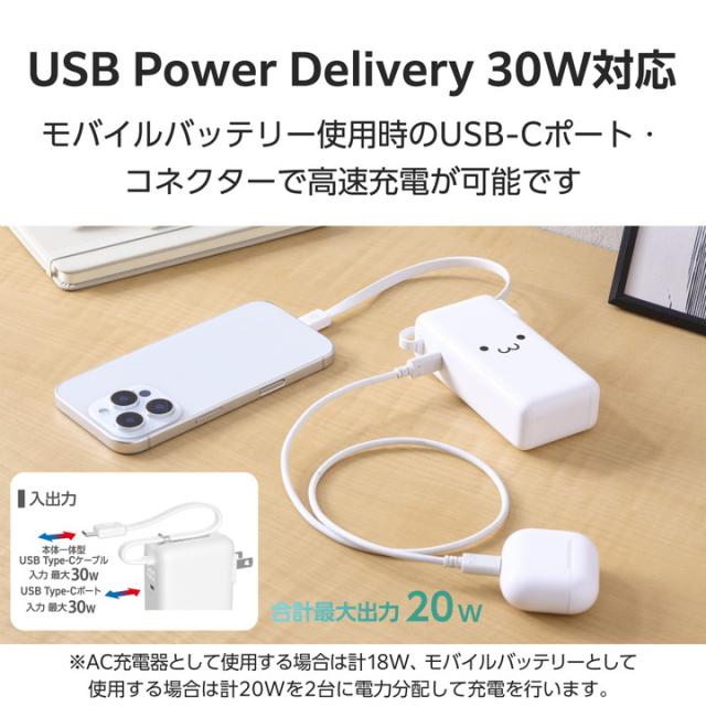 AC充電器としても使える2in1タイプのモバイルバッテリーです。10000mAhの大容量にUSB Type-C(TM)ケーブルが一体化されているため、外出先でも安心して充電できます。バッテリー残量はLEDパネルで1%単位で確認できます。USB Power Delivery対応です。かわいいしろちゃんモデルです。
