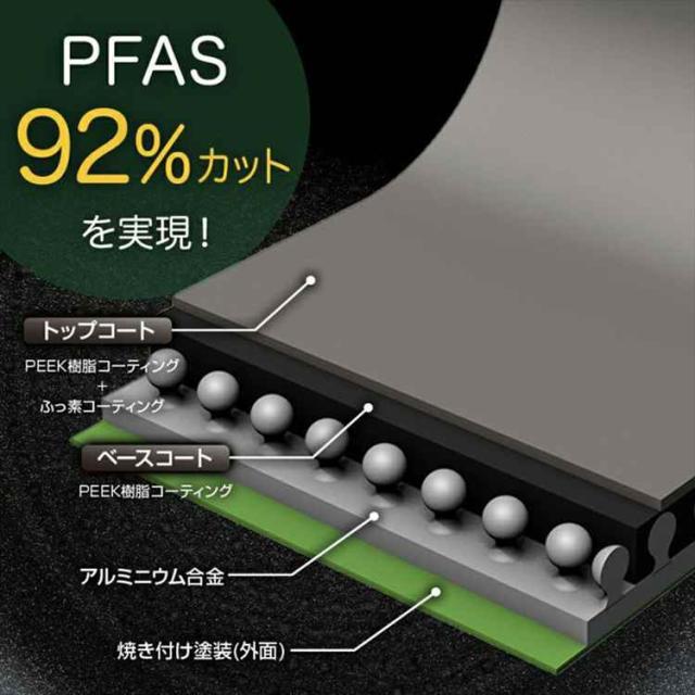 「PFAS(ピーファス)」とは人工的につくられた有機フッ素化合物の総称です。現在、健康や環境への影響が懸念されています。このフライパンでは従来品と比較して、PFASを約92%カット。