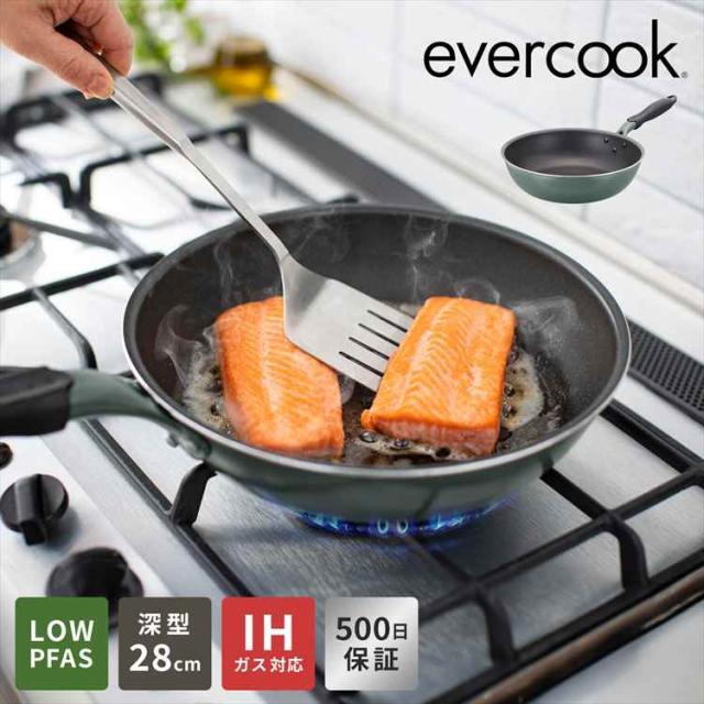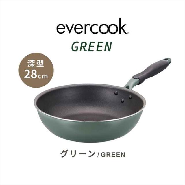 フライパン evercook GREEN エバークック グリーン 28cm 深型 IH ガス EGIDPL28GR 炒め鍋 ドウシシャ DOSHISHA LOW PFAS フッ素 有害物質 PFOS PFOAフリー 安全 軽い 大きめ おしゃれ かわいい くっつかない こびりつかない 焦げ付かない 長持ち 500日保証 ギフト プレゼント