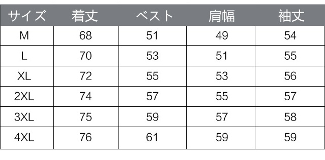 | サイズ | 着丈 | 胸囲 | 肩幅 | 袖丈 |
