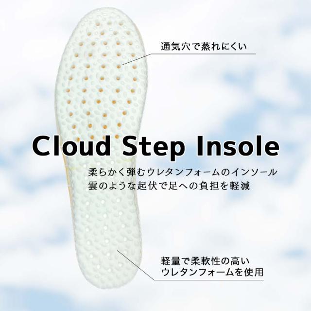 メーカー独自開発の「クラウドステップインソール」は、軽量で柔軟性の高いウレタンフォームを採用し、まるで雲の上を歩くよう名柔らかい履き心地を実現。