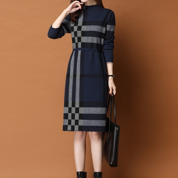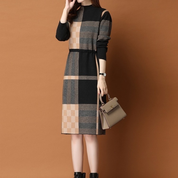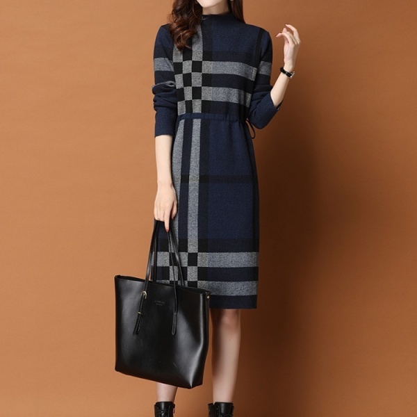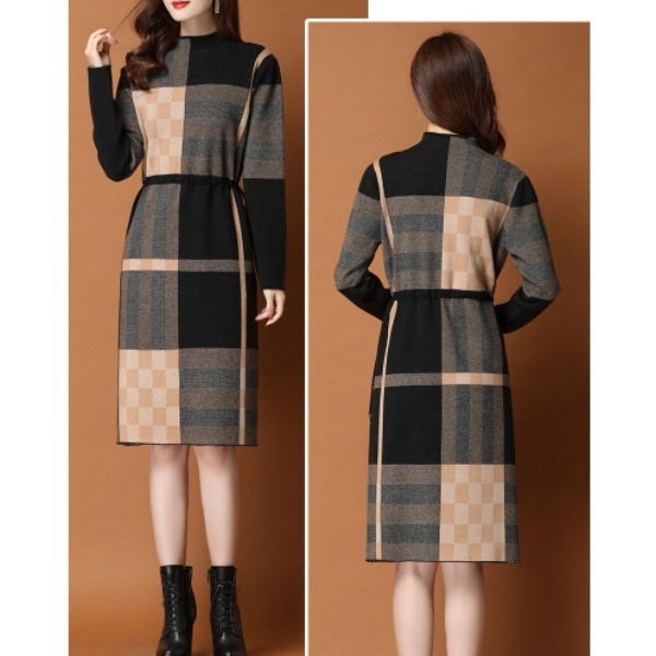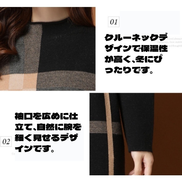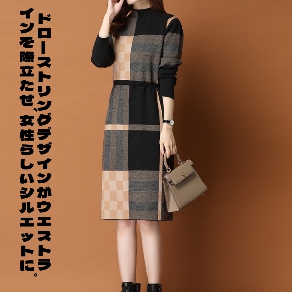 レディース 長袖 チュニック ハイネック ハイネック ワンピース ニットセーター 秋冬 セーター チェック柄 ワンピース ニット ロングセーター ニットワンピ ウェストマーク ワンピース 大人 長袖 膝丈 チェック柄 体型カバー 暖かい