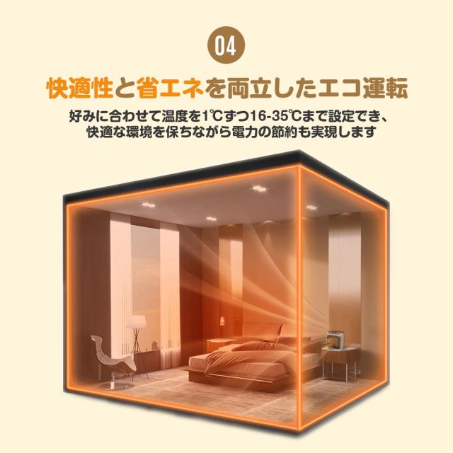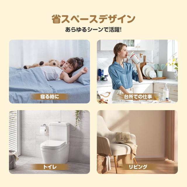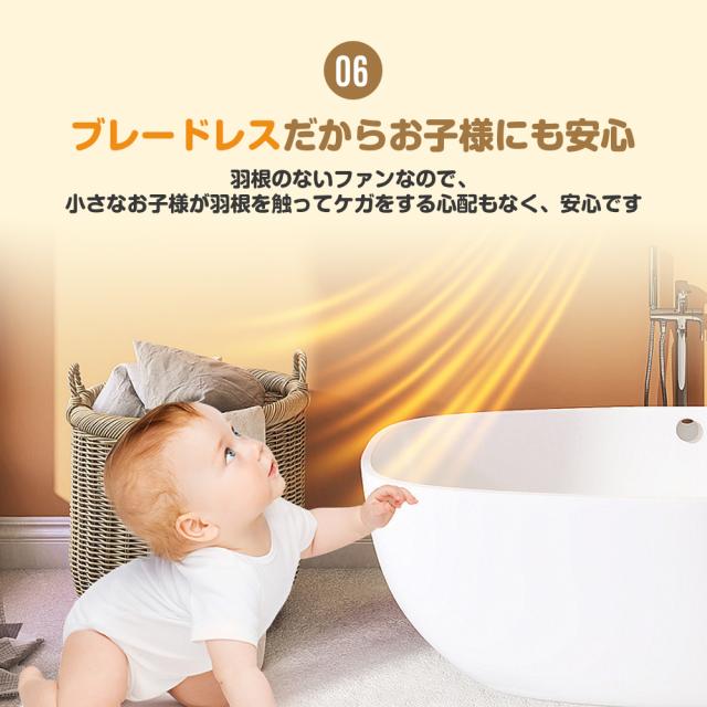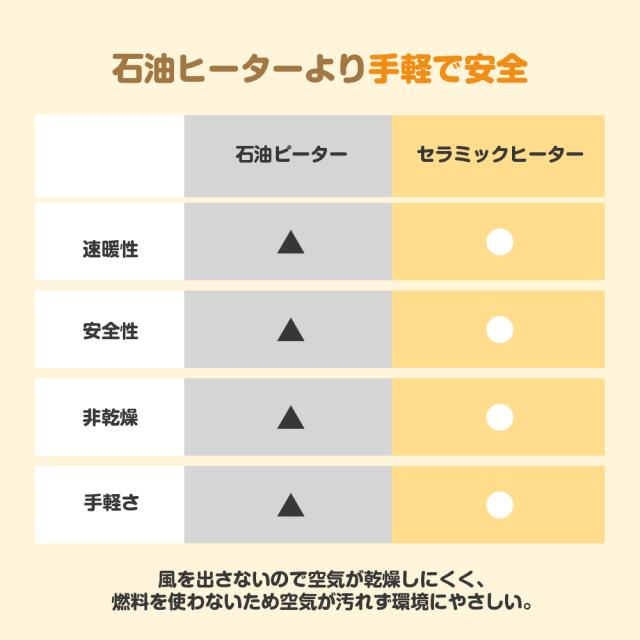 【転倒OFF・多重過熱保護・切り忘れ防止・V0級難燃ボディ】充実した安全機能、安心、安全は何よりの第一。転倒OFF:地震などの不意な原因で転倒すると、電源が自動的に切る。二重過熱保護:内部に温度センサーを搭載し、高温と低温二つの部分の温度を感知して、温度が上昇過ぎた時に、ヒーターが自動的に停止する。切れ忘れ防止:運転開始から6時間後に自動的に停止します。外出の時、電源を消したかの不安は必要ない。難燃性:セラミックヒーターのボディはV0級難燃素材を採用し、安全性さらに固める。
