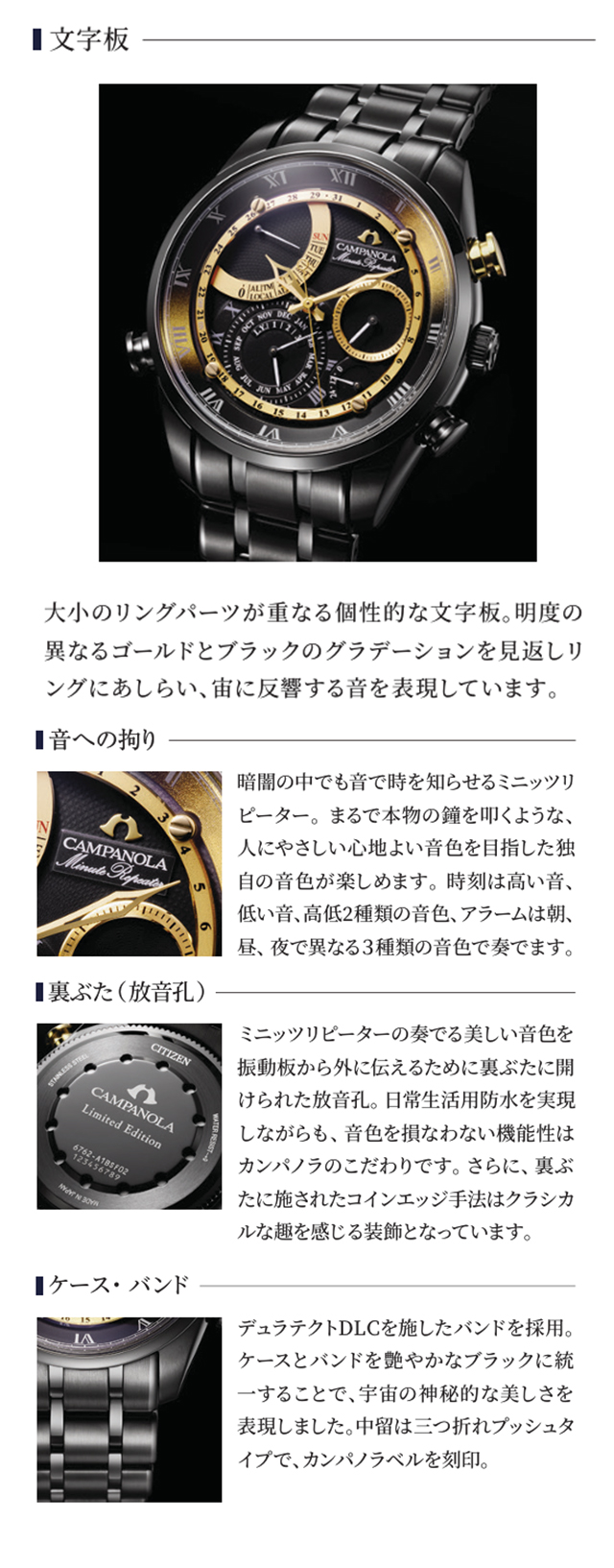 正規品 7年保証キャンペーン 送料無料 シチズン カンパノラ ミニッツリピーター 25周年記念限定モデル 「星響(ほしのひびき)」 数量限定 日本製 メンズ 腕時計 AH7064-52E CITIZEN CAMPANOLA MINUTE REPEATER LIMITED アナログ ブラック 黒 ◆「宙空の美」を表現し、独創のデザインと機構で「時を愉しむ」ためのウオッチ、CAMPANOLA(カンパノラ)。「星響(ほしのひびき)」は、漆黒の宙で響き合う星をテーマに、ブランド25周年を記念した限定モデルです。星々の輝きと音の共鳴をテーマに、人々とカンパノラのロマンが響き合うように願いが込められています。心と宇宙が重なり合う瞬間を表現しています。 発売日:2025年12月発売